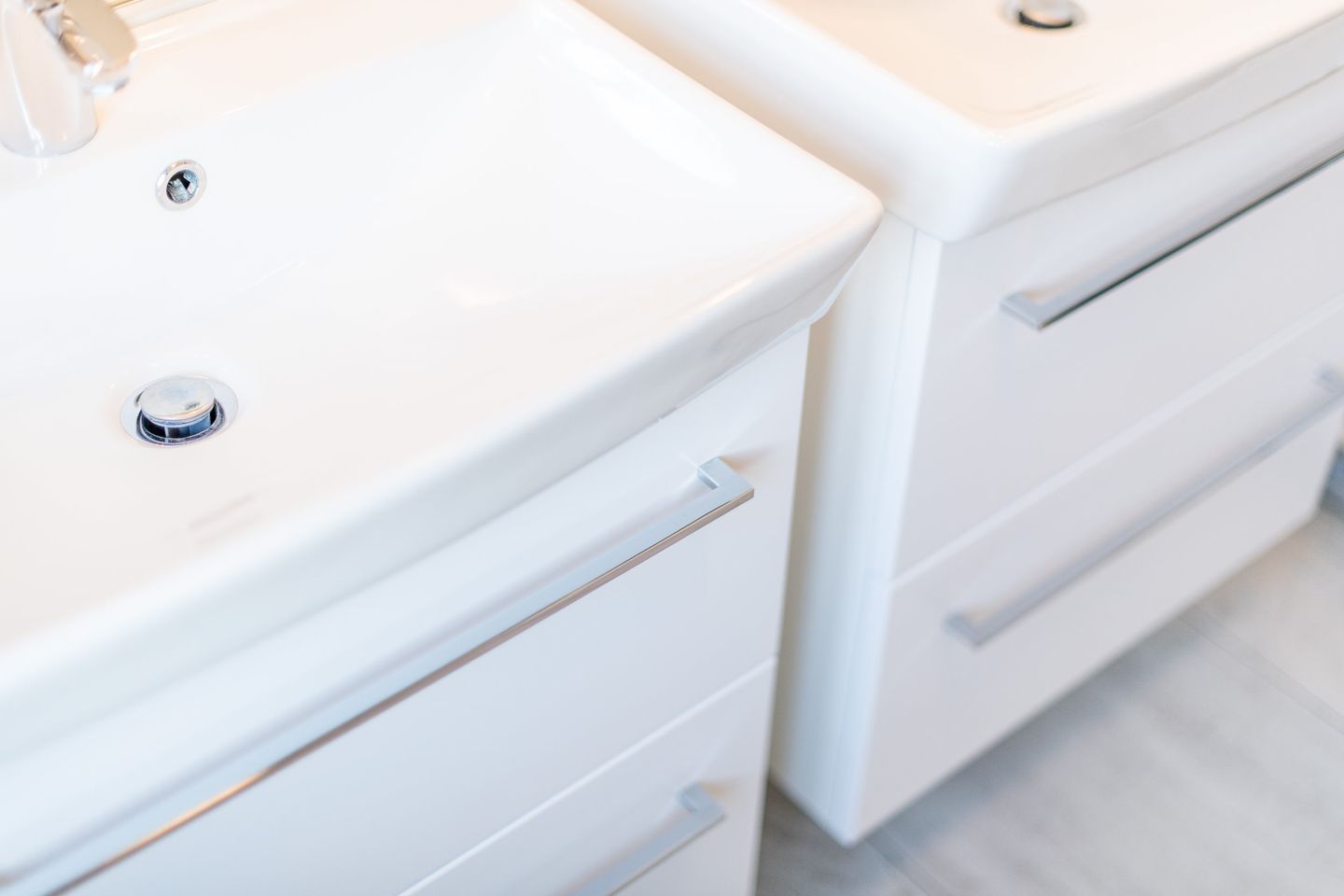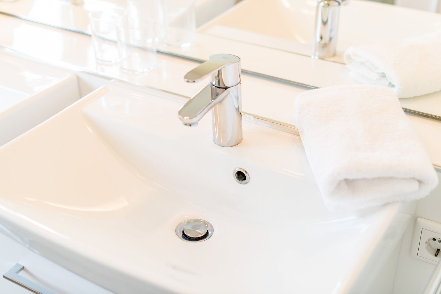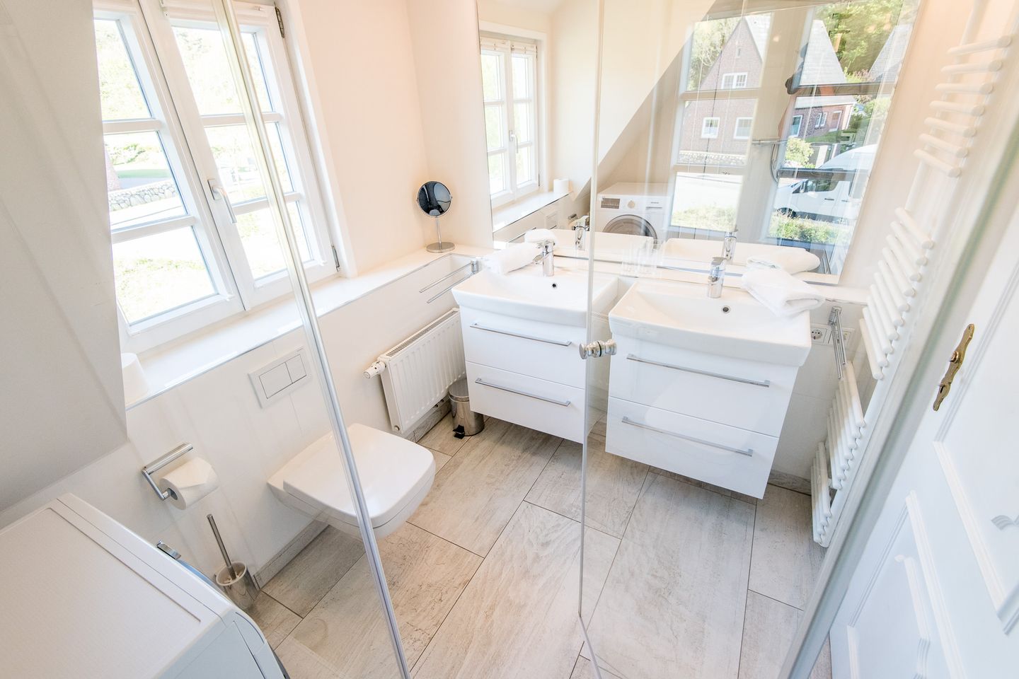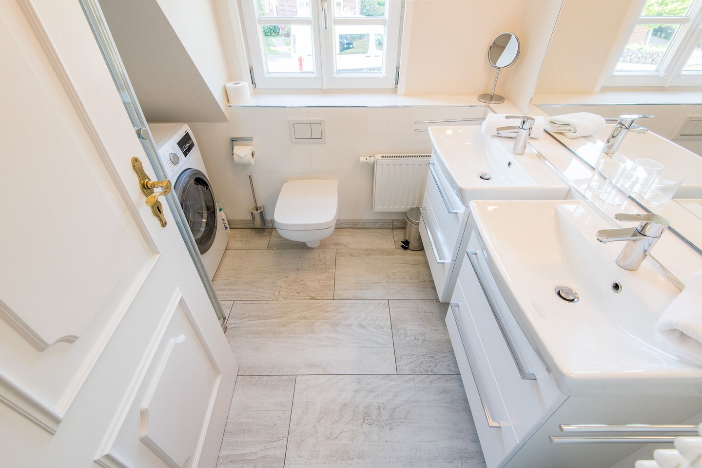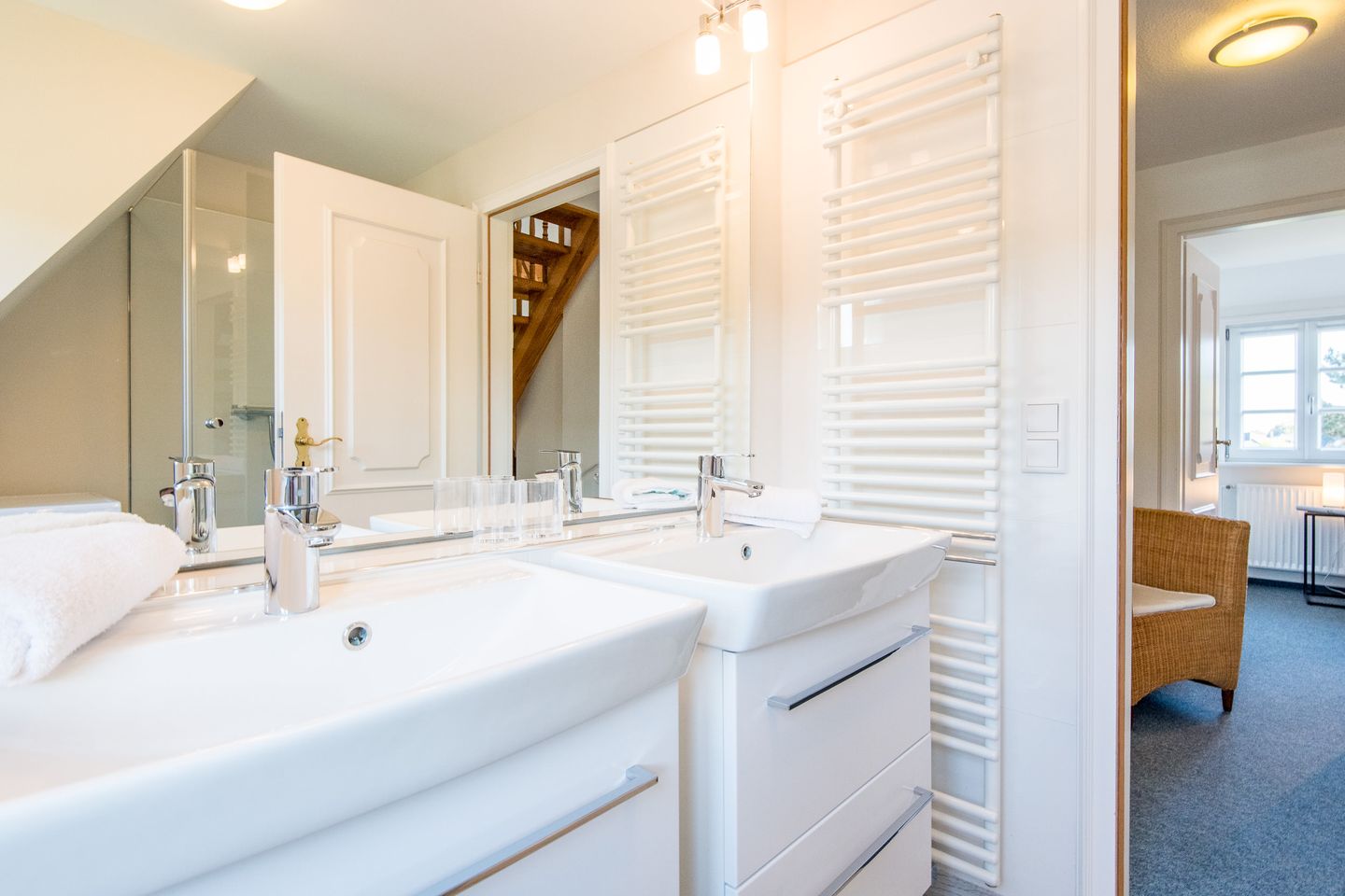 Das Badezimmer verfügt über eine Dusche, zwei Waschbecken, WC und einen Föhn – perfekt für den Start in den Tag.