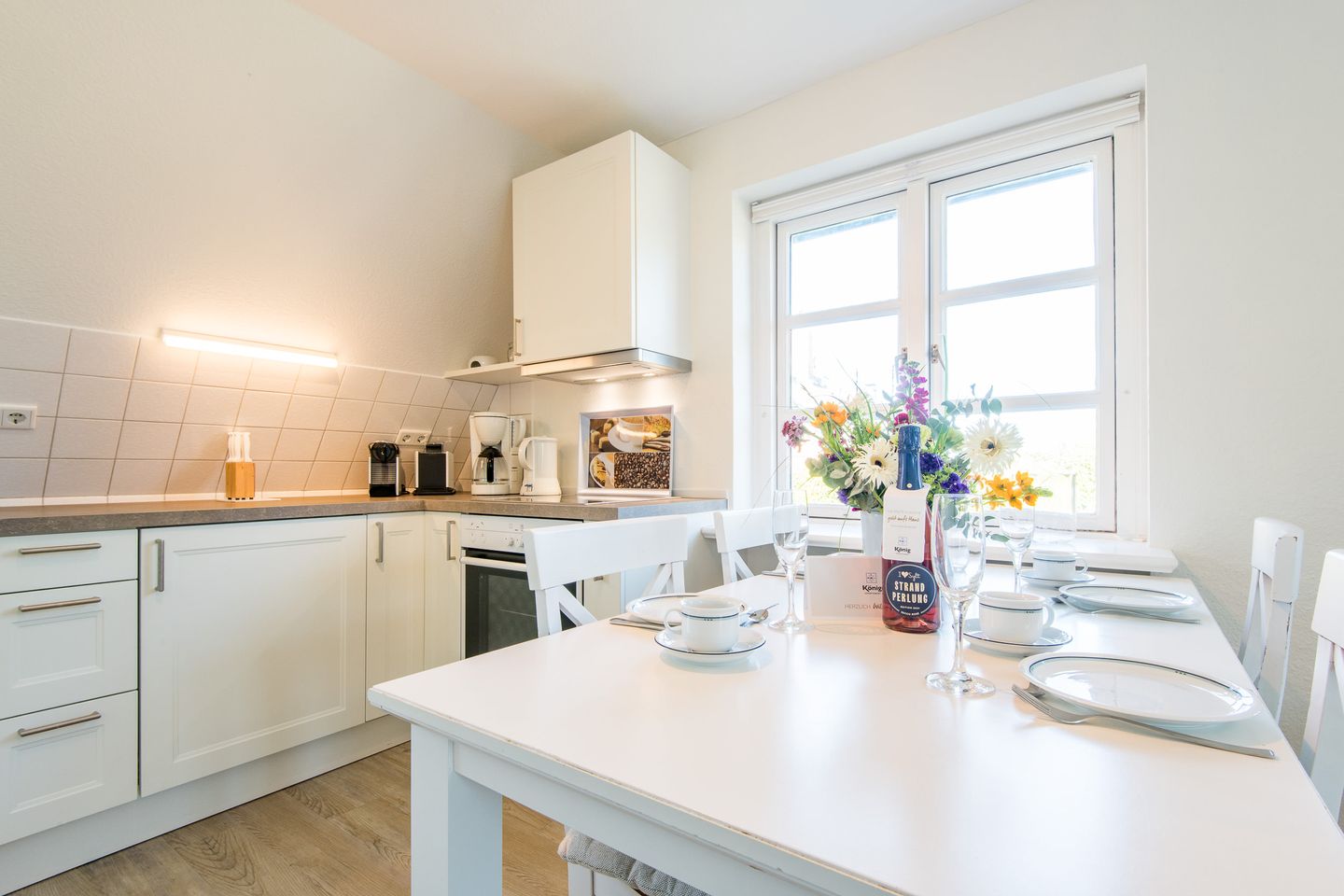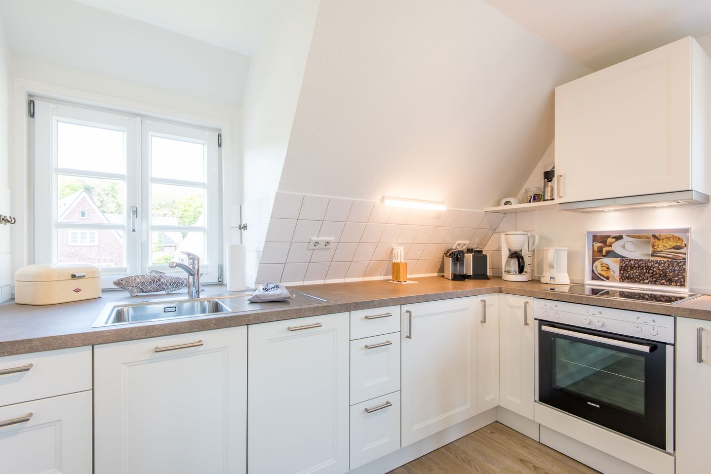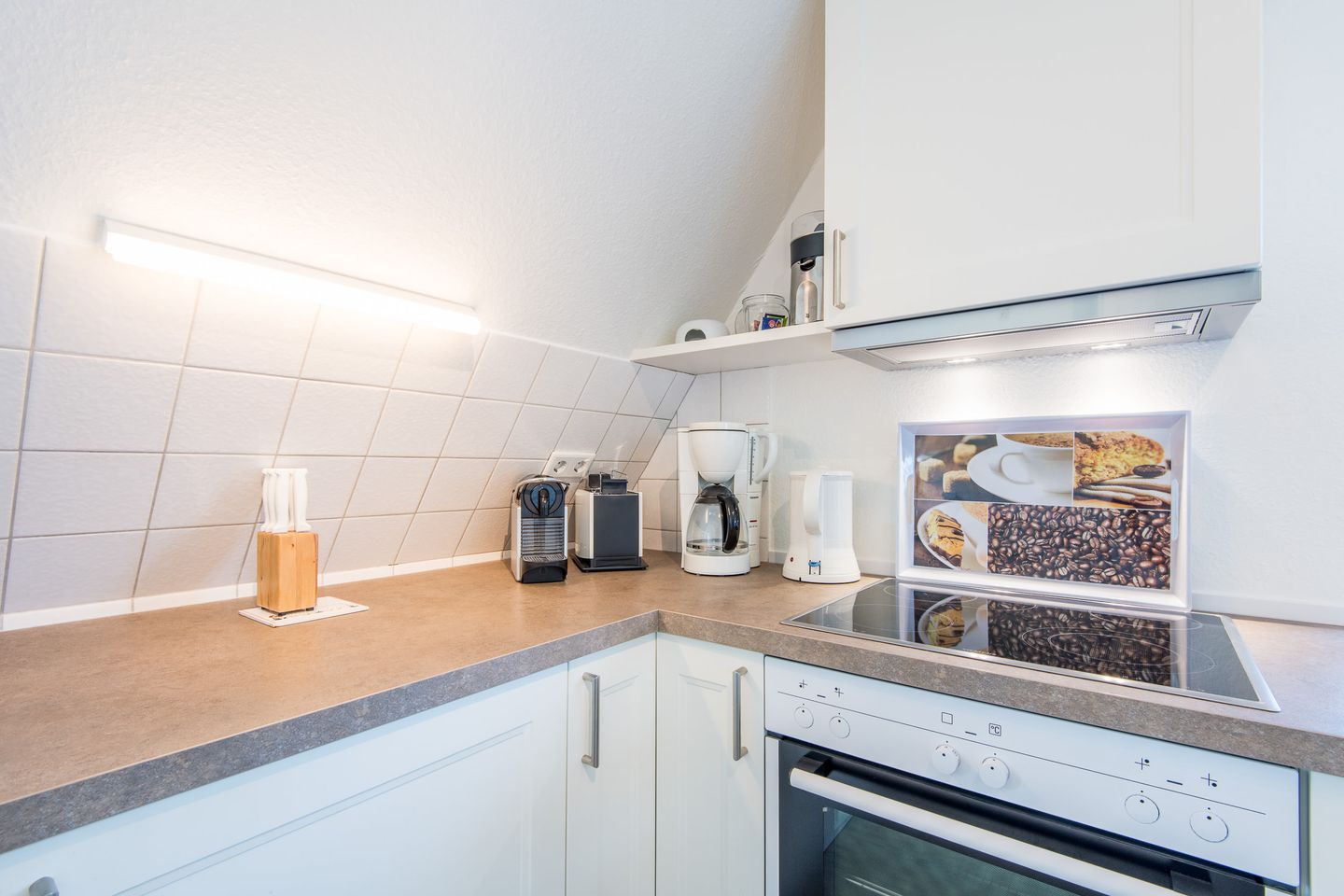 Die offene Küche ist komplett ausgestattet und bietet modernen Komfort, darunter ein Cerankochfeld, Geschirrspüler und Filterkaffeemaschine.