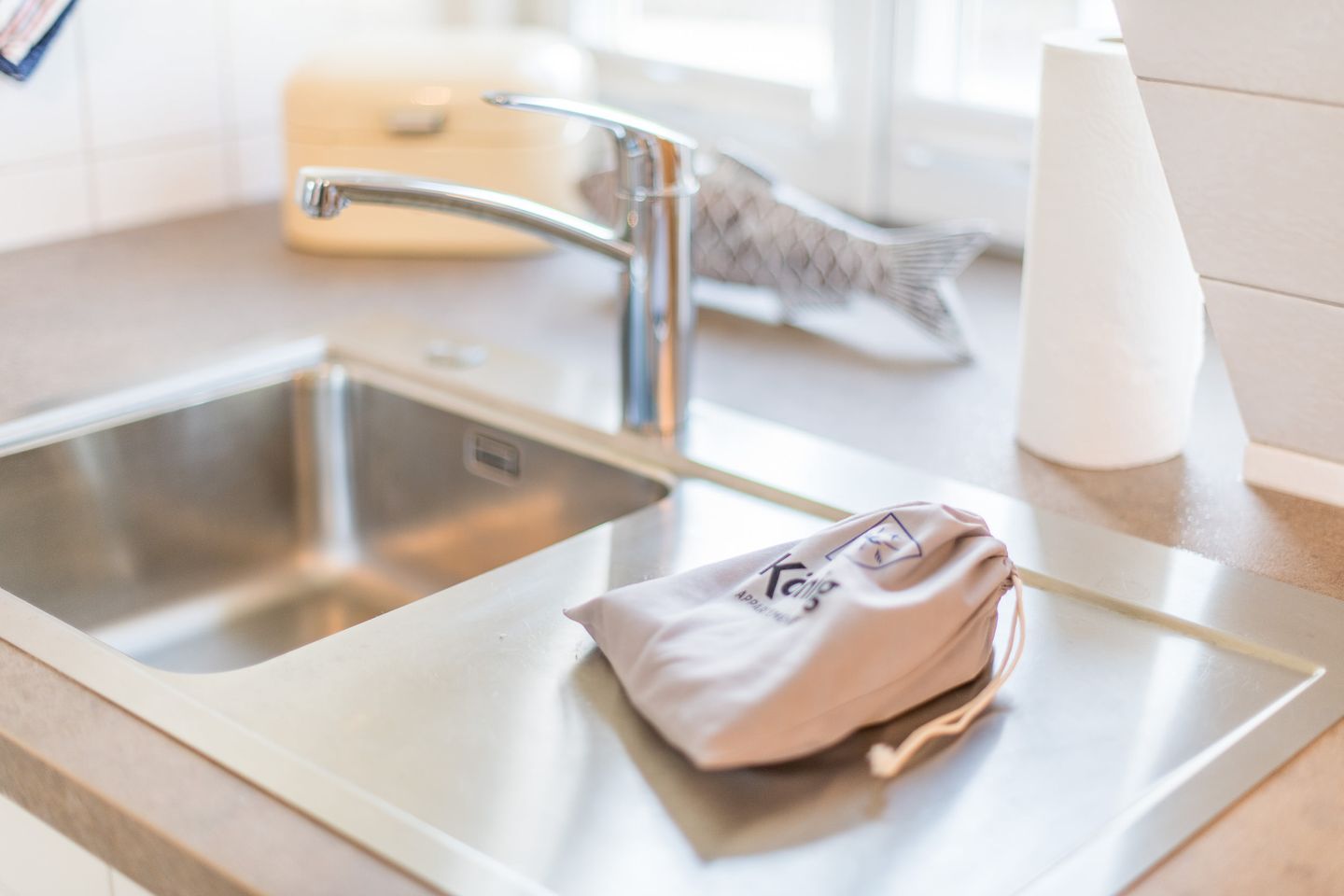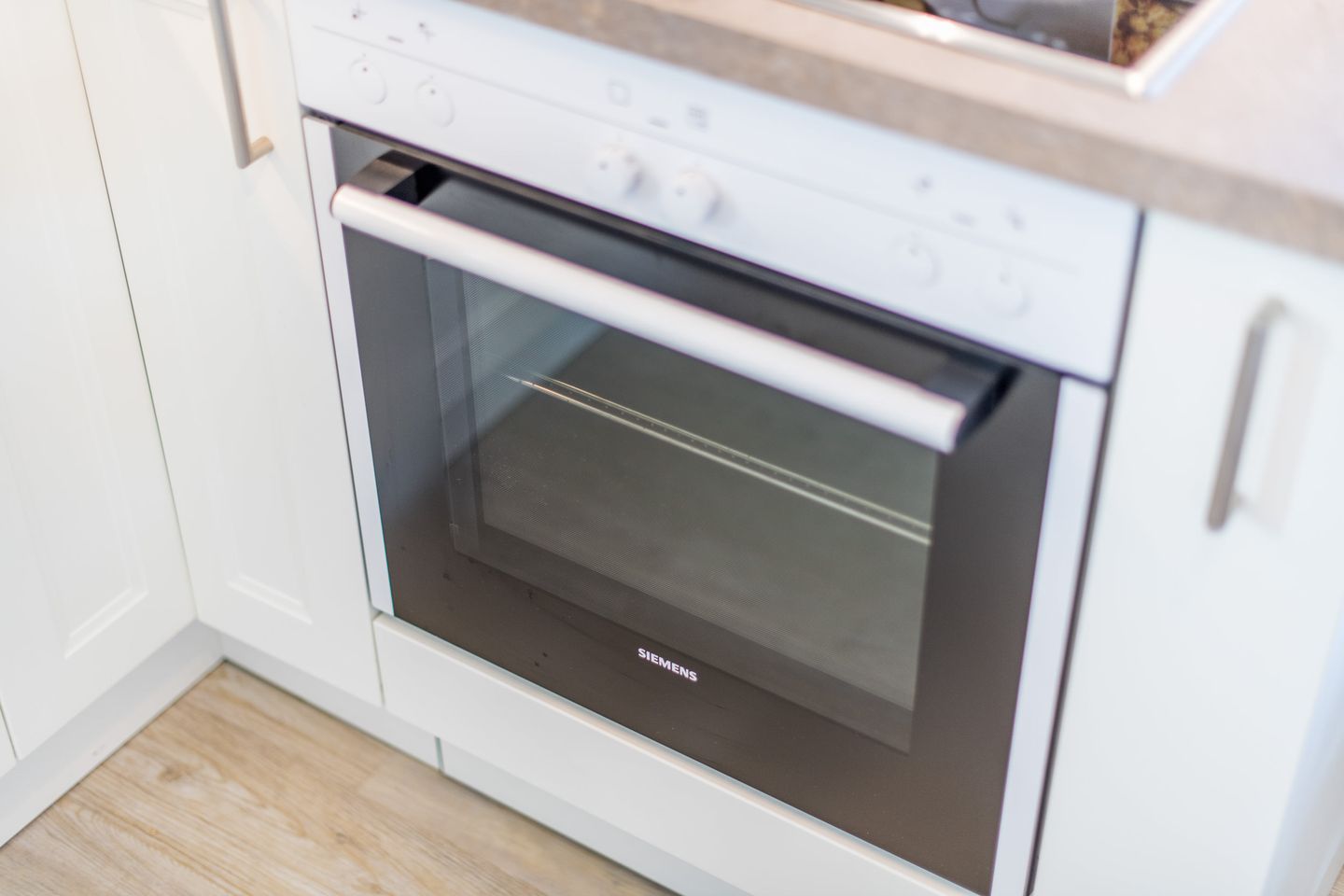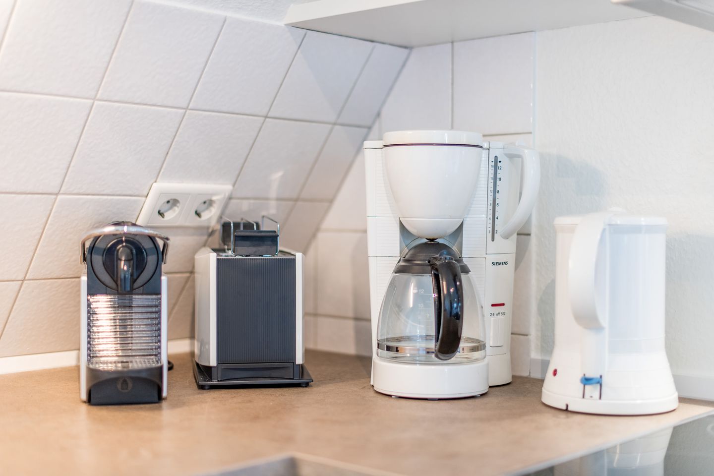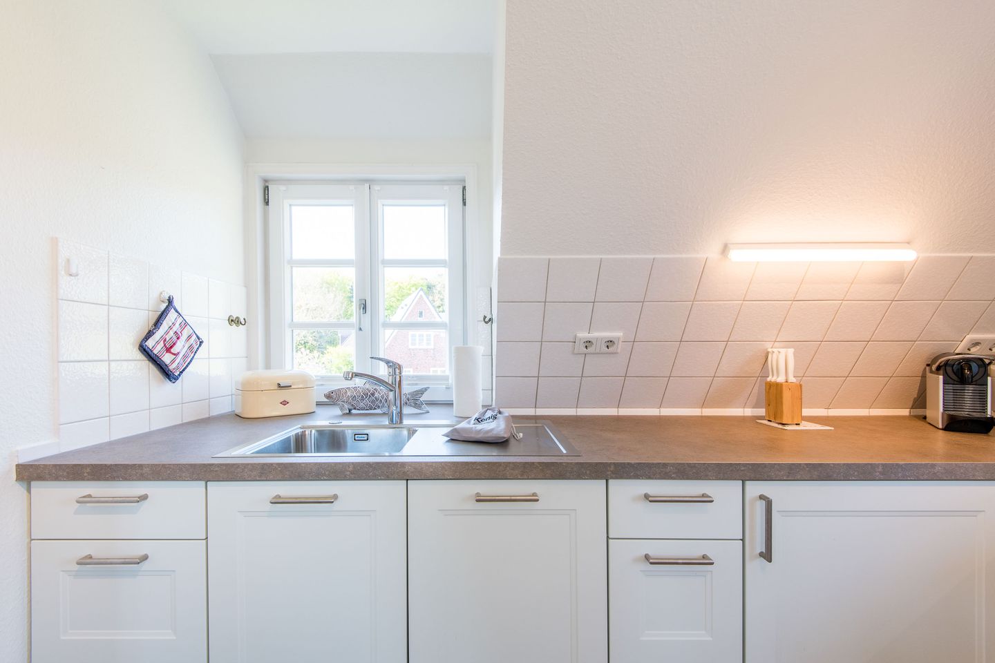 Die offene Küche ist komplett ausgestattet und bietet modernen Komfort, darunter ein Cerankochfeld, Geschirrspüler und Filterkaffeemaschine.