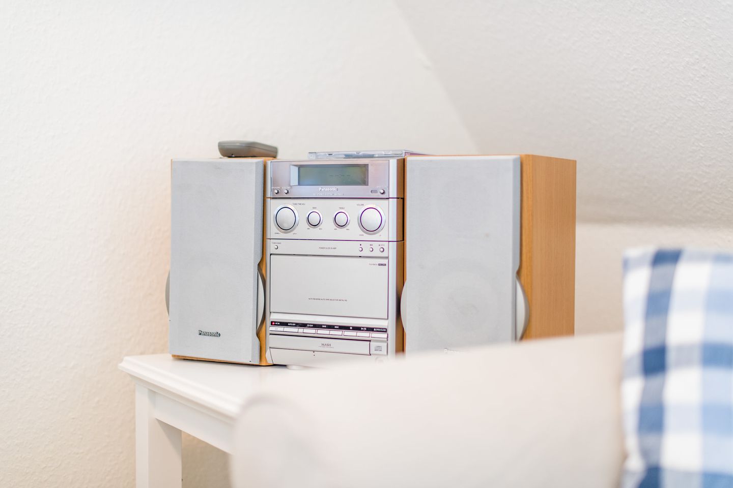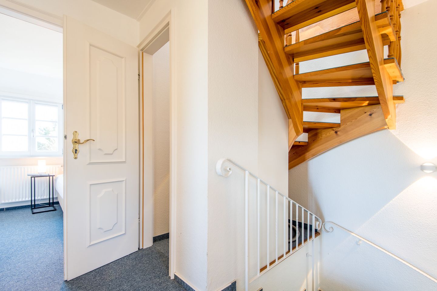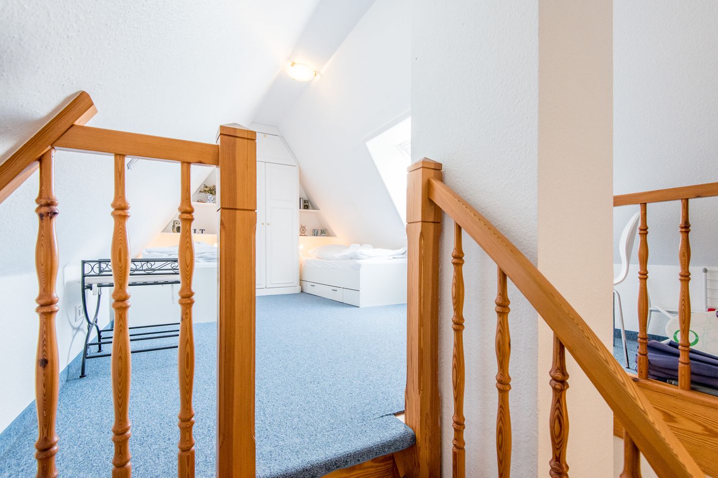 Das Hauptschlafzimmer ist mit einem Doppelbett (180x200 cm), einem TV und einem Kleiderschrank ausgestattet. Das zweite Schlafzimmer im Dachgeschoss verfügt über zwei Einzelbetten (je 90x200 cm), die ideal für Kinder oder weitere Gäste sind.
