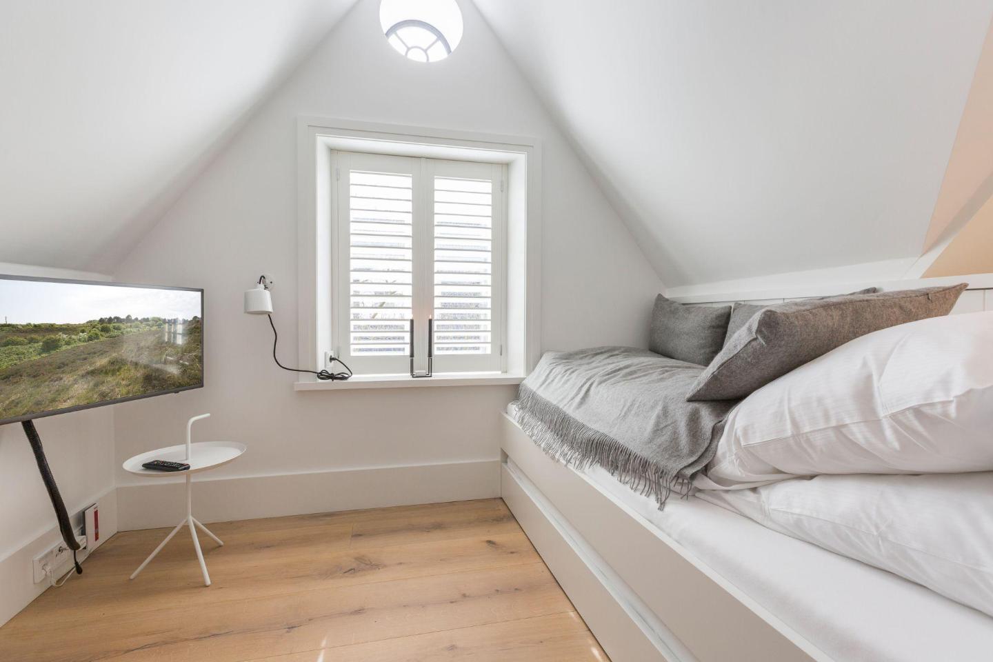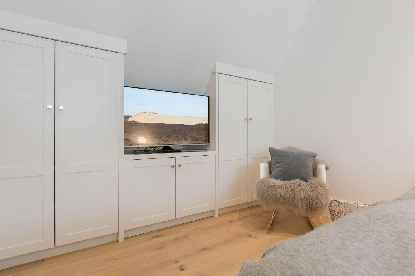 Die drei Schlafzimmer bieten Platz für bis zu 6 Personen und sind stilvoll und komfortabel eingerichtet. Zwei der Schlafzimmer sind mit luxuriösen Boxspring-Doppelbetten (180x210 cm), Einbauschränken und einem TV ausgestattet – ideal für erholsame Nächte. Das dritte Schlafzimmer verfügt über ein Einzelbett (90x200 cm) sowie ein ausziehbares Bett, das ebenfalls als Couch genutzt werden kann. Hier finden auch Kinder oder zusätzliche Gäste einen komfortablen Schlafplatz.