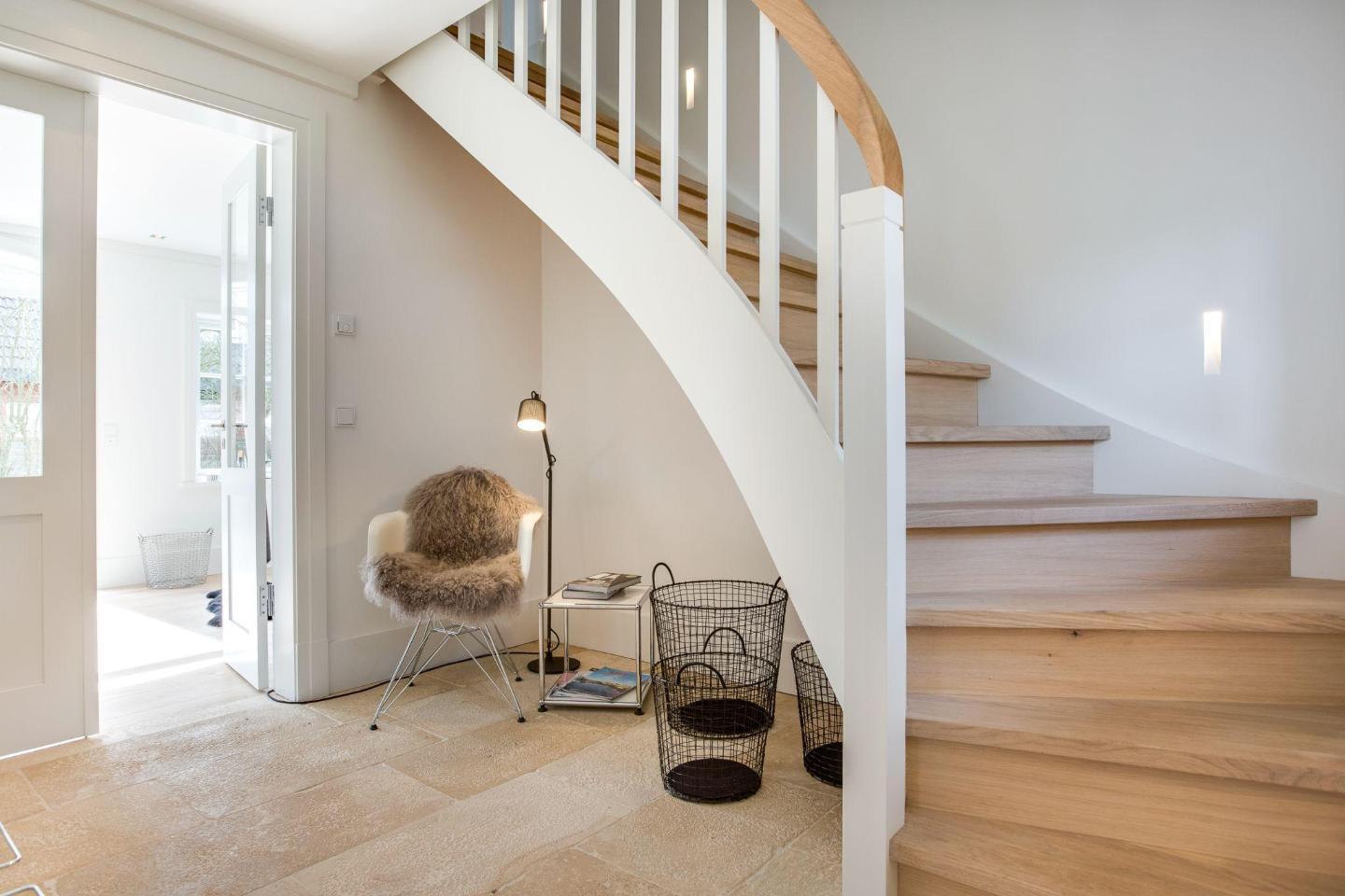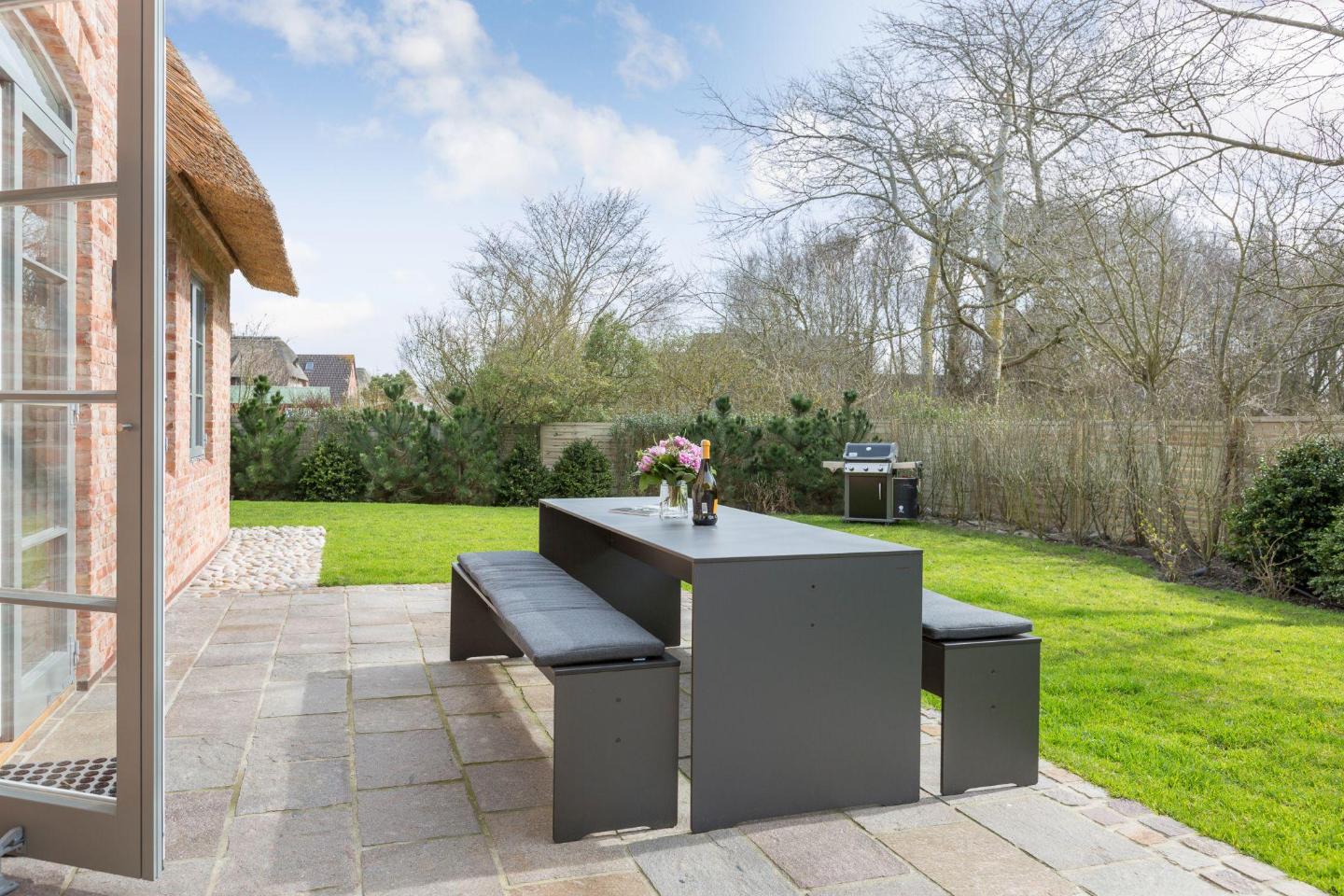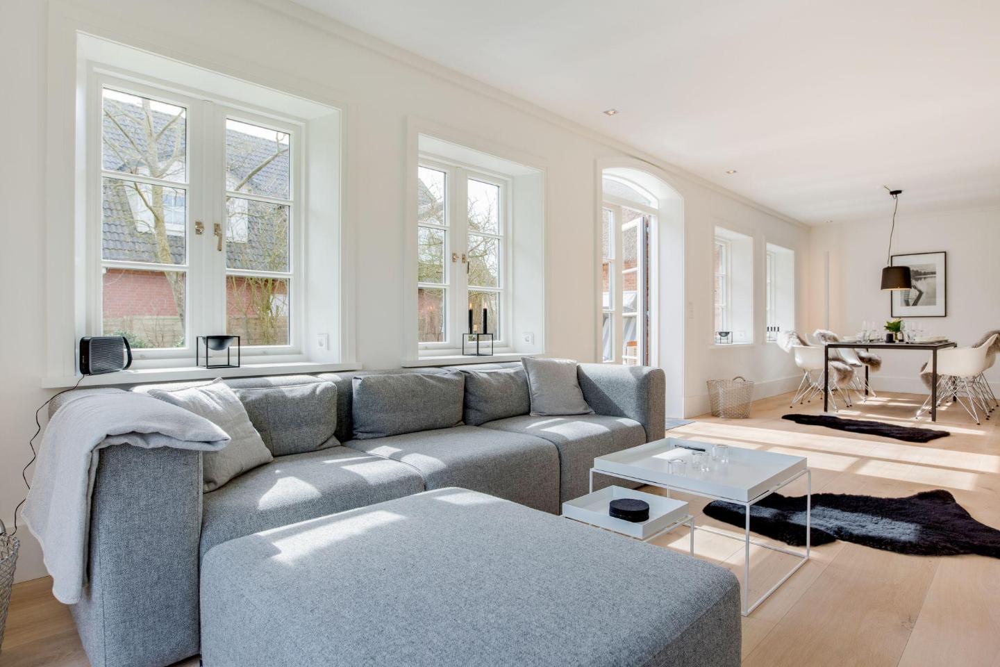 Das großzügige Wohnzimmer besticht durch nordisches Design und hochwertigen Komfort. Ein gemütlicher Kamin sorgt für wohlige Wärme an kühleren Abenden, während die großen Fensterfronten viel Licht hereinlassen und Ihnen direkten Zugang zum weitläufigen Garten und zu den beiden Terrassen bieten. Hier können Sie sich nach einem Tag am Strand entspannen, die Sonne genießen oder den Abend bei einem Glas Wein ausklingen lassen.
