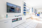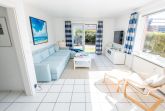 Das gemütliche Wohnzimmer verfügt über ein Schlafsofa (140x200 cm), einen Relax-Sessel mit Hocker und einen Esstisch mit 4 Stühlen. Moderne Unterhaltungsmöglichkeiten durch TV. Vom Wohnzimmer haben Sie direkten Zugang zur möblierten Gartenterrasse nach Süd-Westen, die mit einem Strandkorb ausgestattet ist – ideal zum Entspannen und Genießen der Sonne.