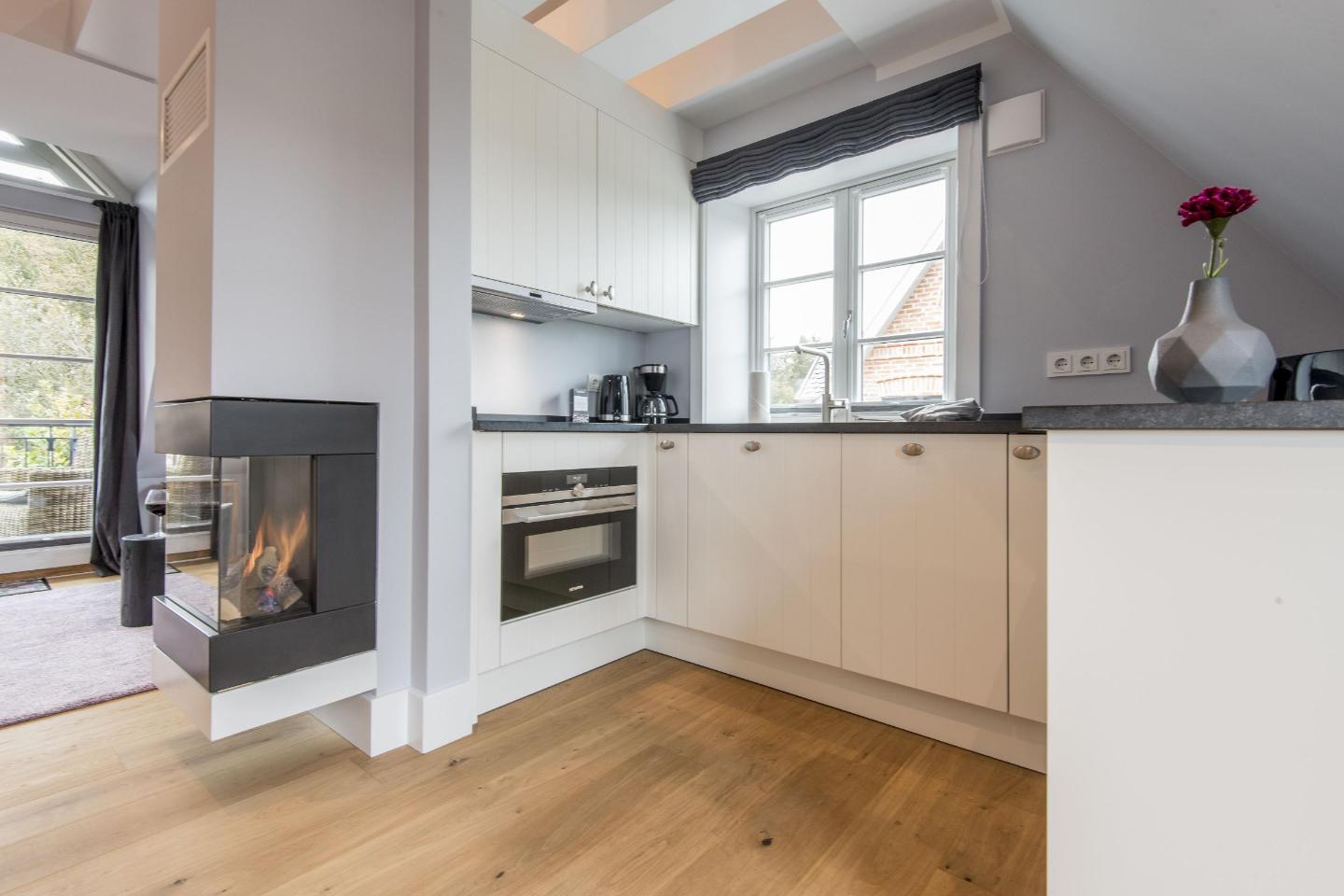 Das stilvoll gestaltete Wohnzimmer ist mit einem gemütlichen Sofa und TV ausgestattet, während ein eleganter Essbereich Platz für zwei Personen bietet. Ein Gaskamin sorgt für besondere Wohlfühlmomente und rundet das exklusive Ambiente ab. Von hier aus gelangen Sie direkt auf den sonnigen Südbalkon, der mit hochwertigen Gartenmöbeln ausgestattet ist und sich ideal für entspannte Stunden an der frischen Luft eignet.