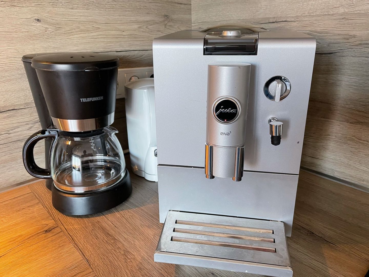 angrenzende komplette Küchenzeile mit Spülmaschine, Nespresso De'Longhi Essenza Mini EN 85.R-Kapselmaschine etc.sowie Essbereich