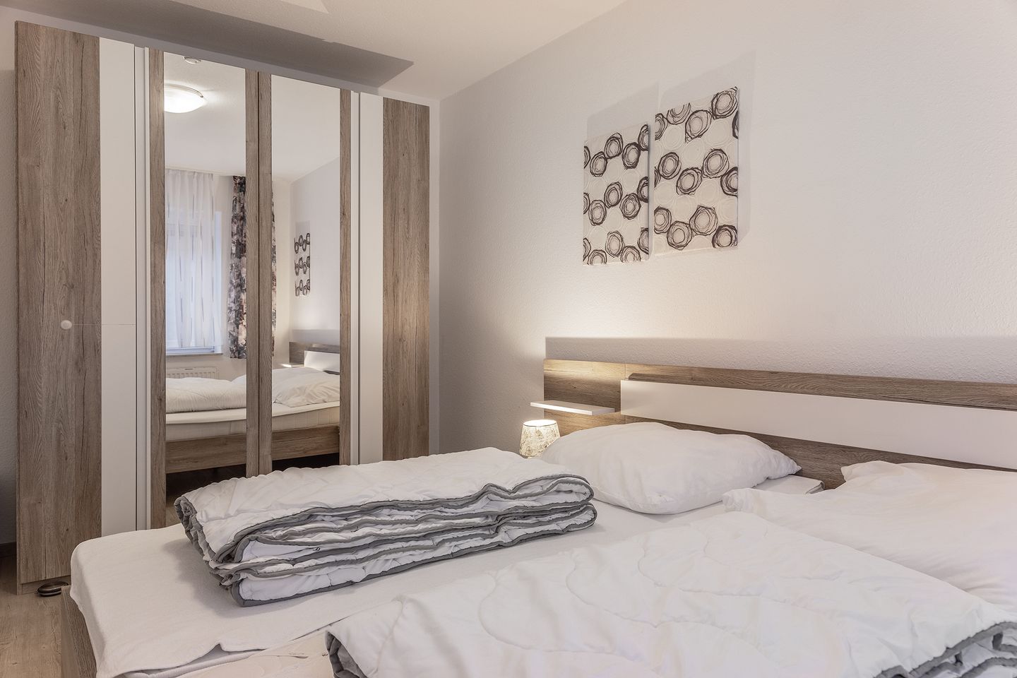 1 Schlafzimmer mit Doppelbett und zustellbarem Kinderreisebett, ein 2. Doppelbett befindet sich hinter einem Raumteiler im Wohnbereich.