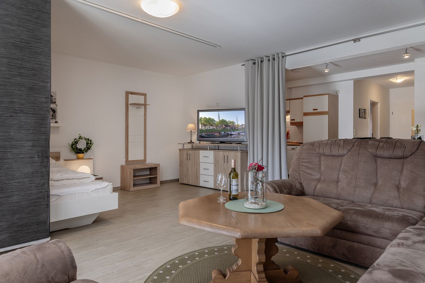 Die Wohnung wurde 2019 komplett renoviert. Es handelt sich um eine stilvolle moderne und doch gemütliche Erdgeschosswohnung für gehobene Ansprüche. Die Ferienwohnung ist am besten für Paare und Familien geeignet, die etwas Platz zum Erholen wünschen. Die Wohnung verfügt über einen offenen und großen Wohn-/Essbereich mit abgetrenntem Schlafbereich, ein separates Schlafzimmer mit Doppelbett, eine umfangreich ausgestattete Küche mit Backofen, Spülmaschine, Mikrowelle sowie ein geräumiges Bad mit ebenerdiger Dusche, WC und Waschmaschine. Zum Sonnen bietet sich auch in der kühleren Jahreszeit die windgeschützte Terrasse mit Abendsonne an. Der eigene PKW-Abstellplatz befindet sich direkt am Haus, Abstellraum für Fahrräder vorhanden, Bollerwagen und Strandspielzeug können kostenfrei genutzt werden. 1 Gehminute zum Yachthafen und 5 Gehminuten bis zum Strand.
