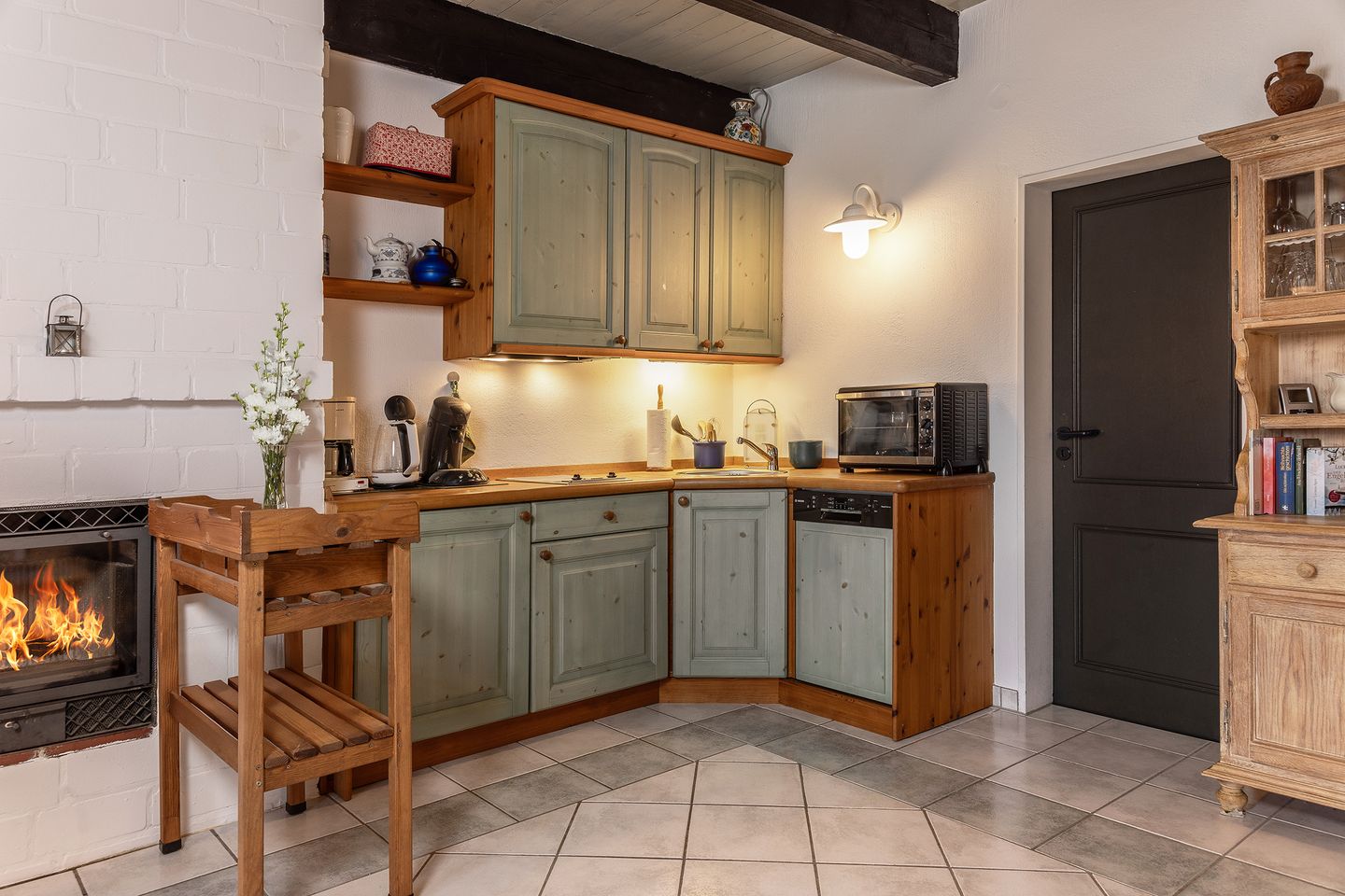 Im Erdgeschoss ist ein Wohnraum mit Stein-Kamin und einer kompletten Küche mit Geschirr, Herd, Kühlschrank und Geschirrspüler.