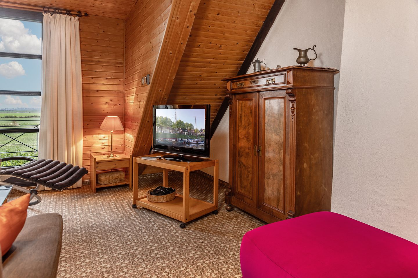 Im gemütlichen Wohnzimmer in der ersten Etage steht ein moderner Fernseher.