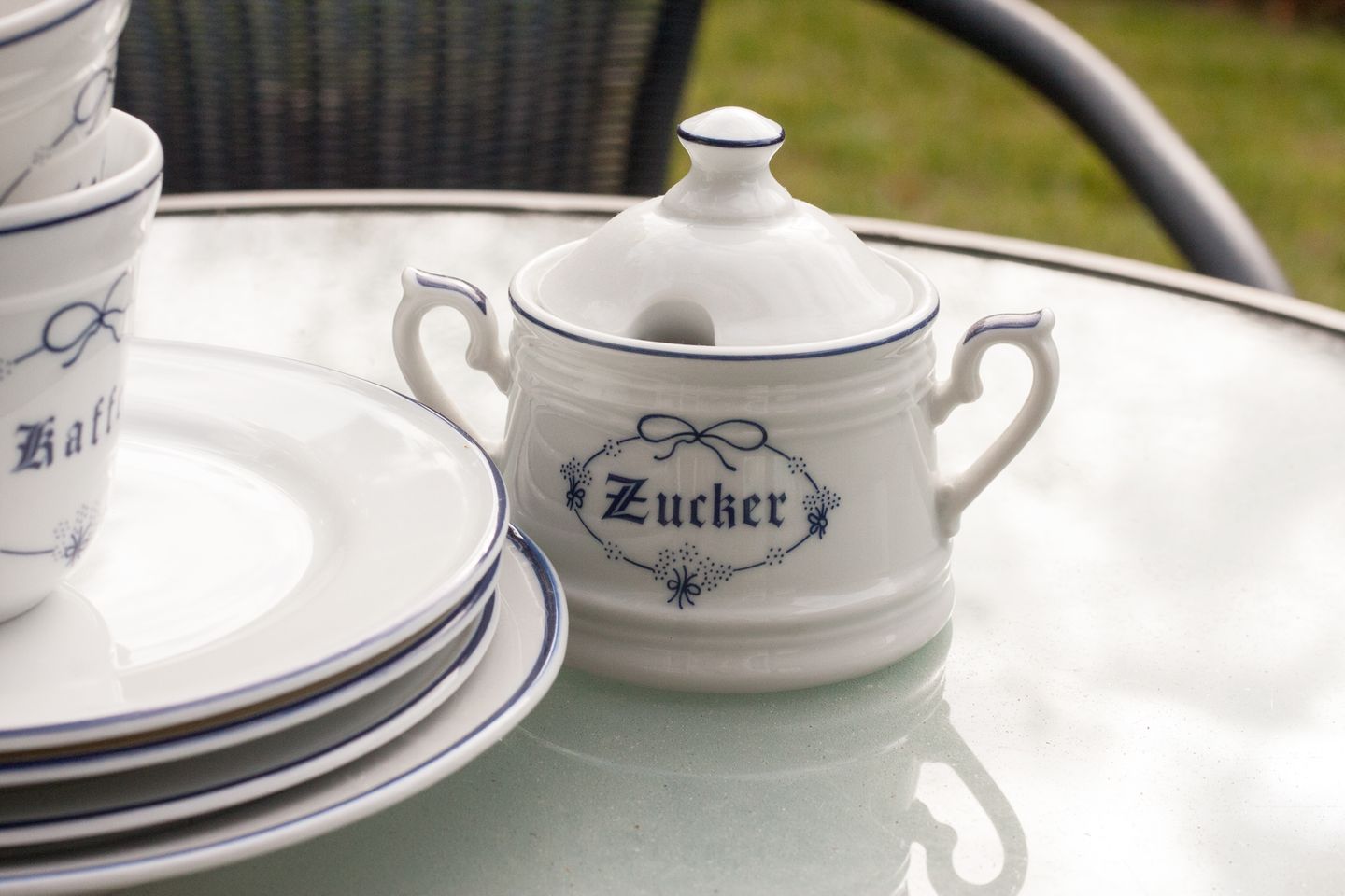 Terrasse mit Garten und Gartenmöbeln.