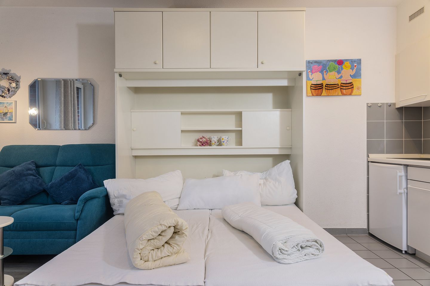 Wohnzimmer mit Schrankbett (2 Matratzen 180x90cm), Essecke, Sat -TV, DVD- Player sowie Stereoanlage, Küchenzeile