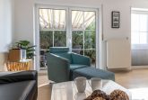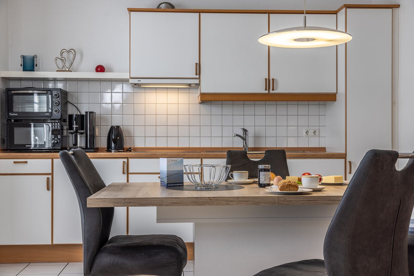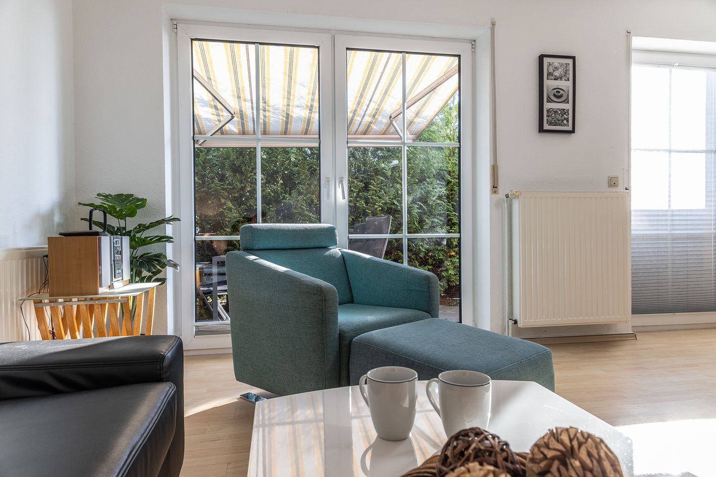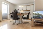 Helles, freundliches Wohnzimmer mit Radio, TV, angrenzende, gepflegte Küchenzeile mit Essecke und Kinderhochstuhl.