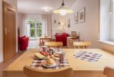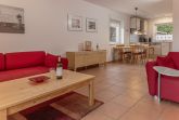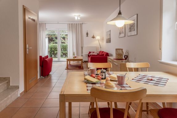 Wohn-/Esszimmer (Fußbodenheizung) mit Sat- TV, Stereoanlage, offener Küchenbereich mit Küchenzeile (Senseo-Kaffeemaschine), mit Essplatz und Kinderhochstuhl, Gäste- WC, Abstellraum mit Waschmaschine,