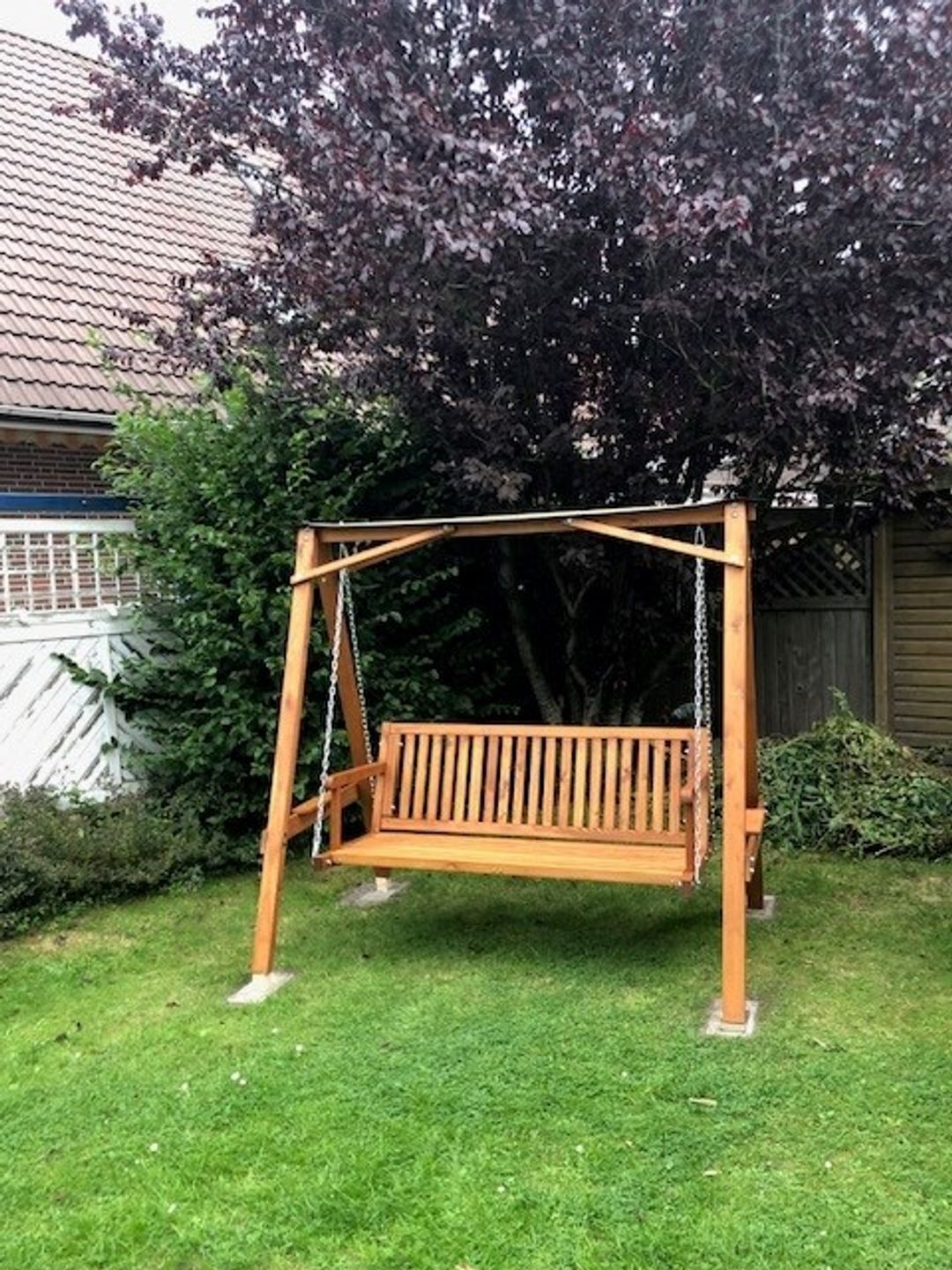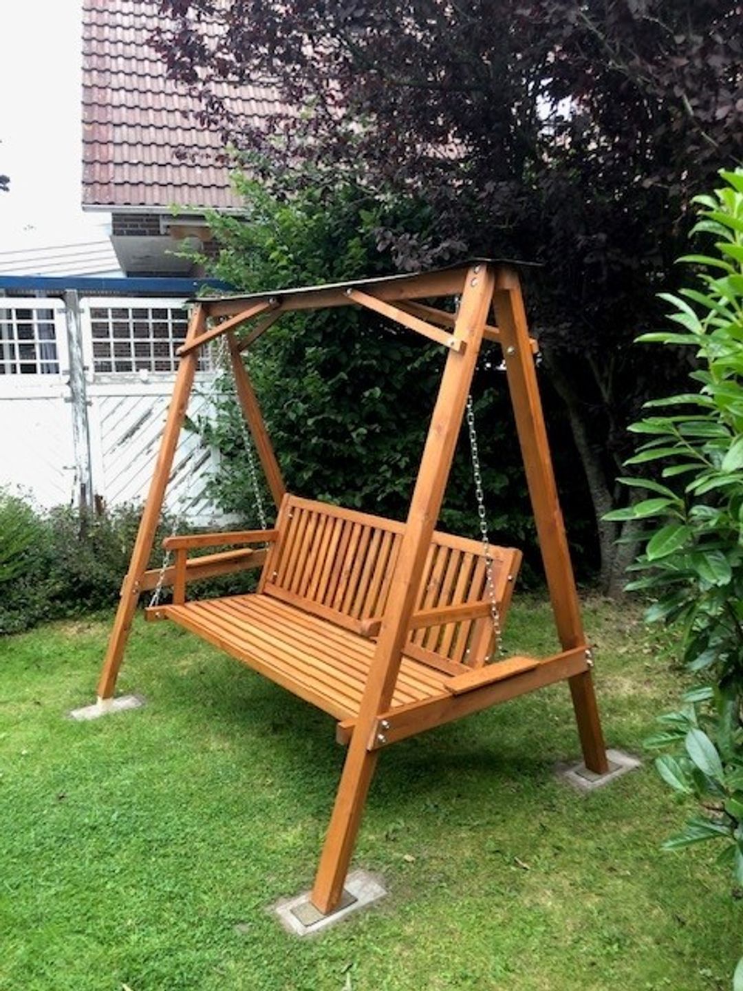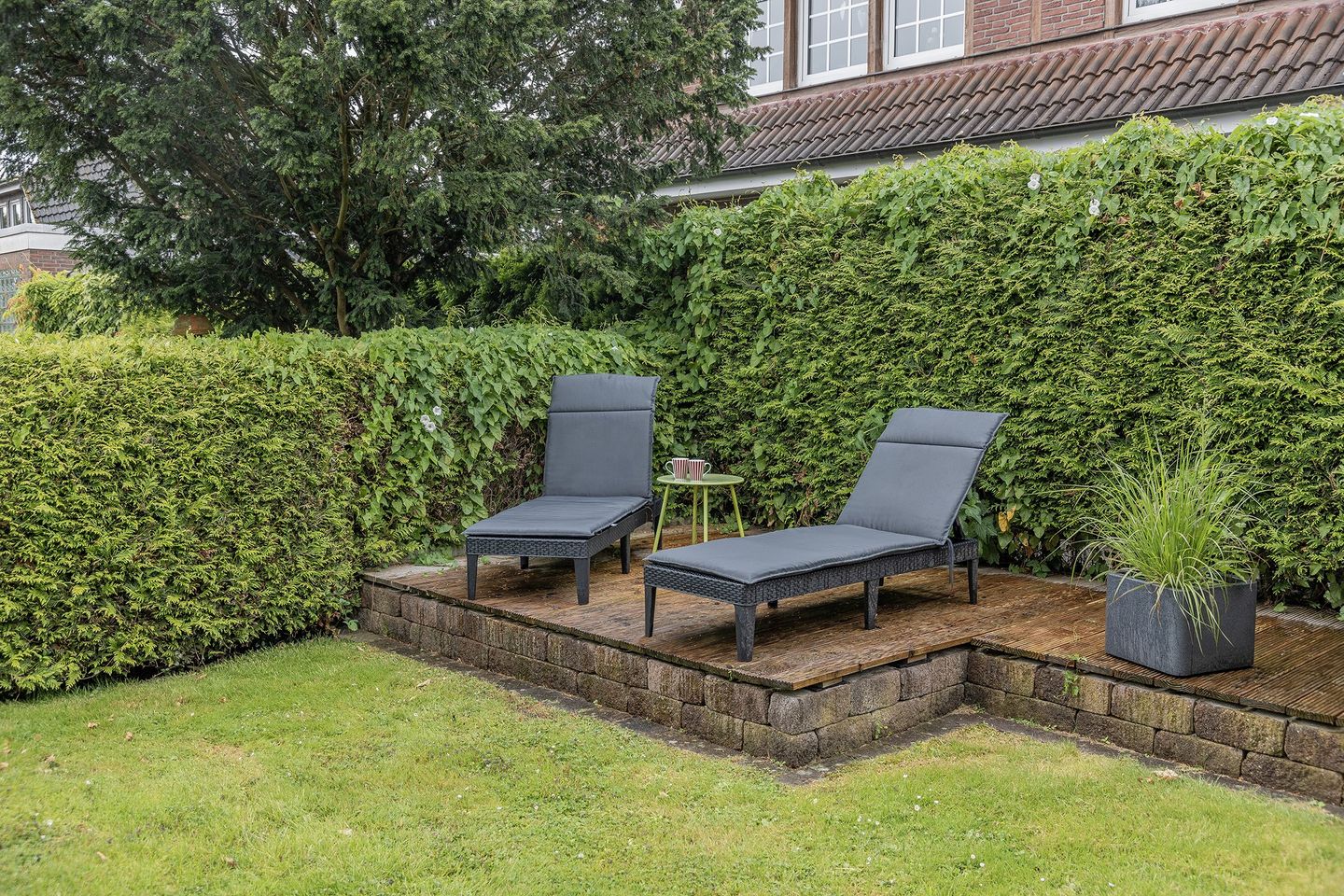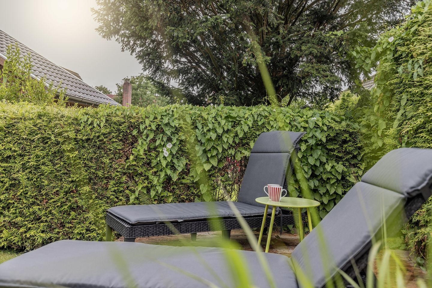 Ausgang zur Terrasse mit Garten in Nord-West-Lage mit Gartenmöbeln, Hollywoodschaukel und Sandkasten