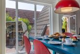 Das Haus hat ein sehr geräumiges Wohn-Ess-Zimmer mit Wintergarten, Lesesessel und großer Couch.