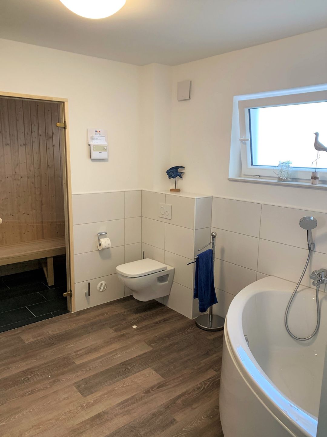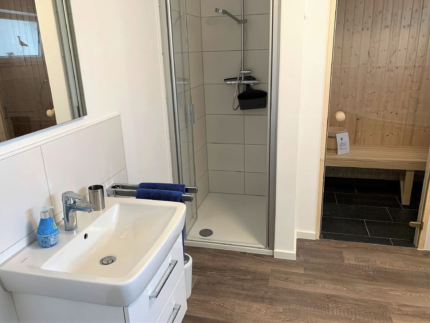 An stürmischen und/oder regnerischen Tagen kann das Badezimmer mit eigener Sauna und seiner Vollausstattung schnell zum Wellnesstempel werden.