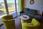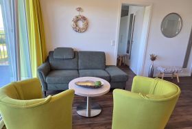 Der helle Wohnbereich verfügt über ein Sofa, einen Couchtisch und zwei Sessel.