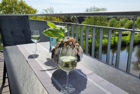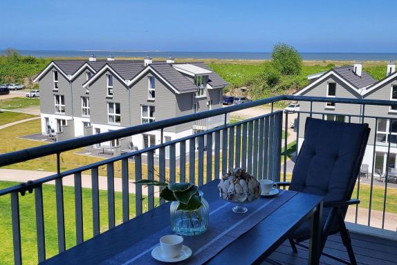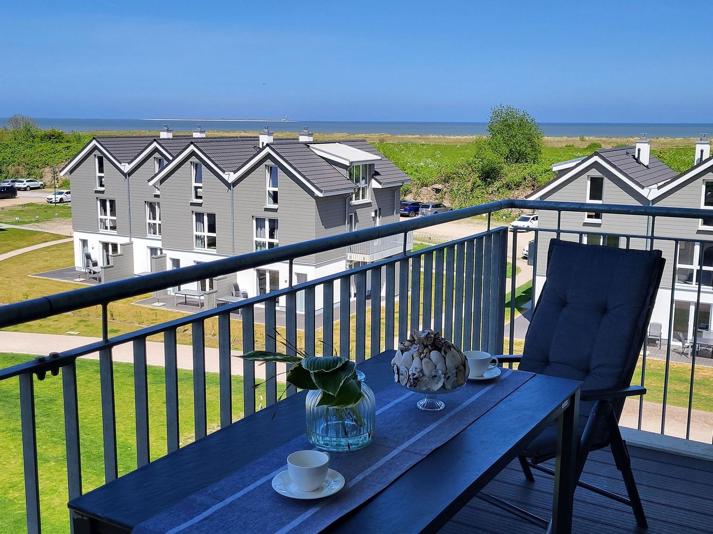 Eine großzügiger, möblierter und überdachter Balkon lädt zum Verweilen ein.