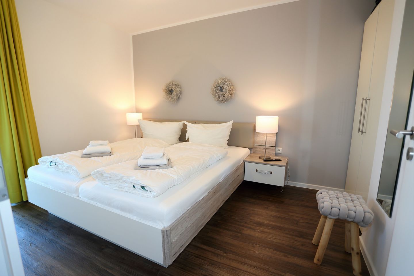 Im Schlafzimmer steht Ihnen ein modernes Doppelbett mit Nachtkonsolen und ein Kleiderschrank zur Verfügung.