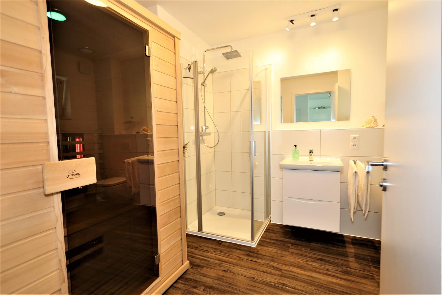 Das Badezimmer ist sehr großzügig geschnitten und mit einer ebenerdigen Dusche und einer Infrarotkabine ausgestattet.