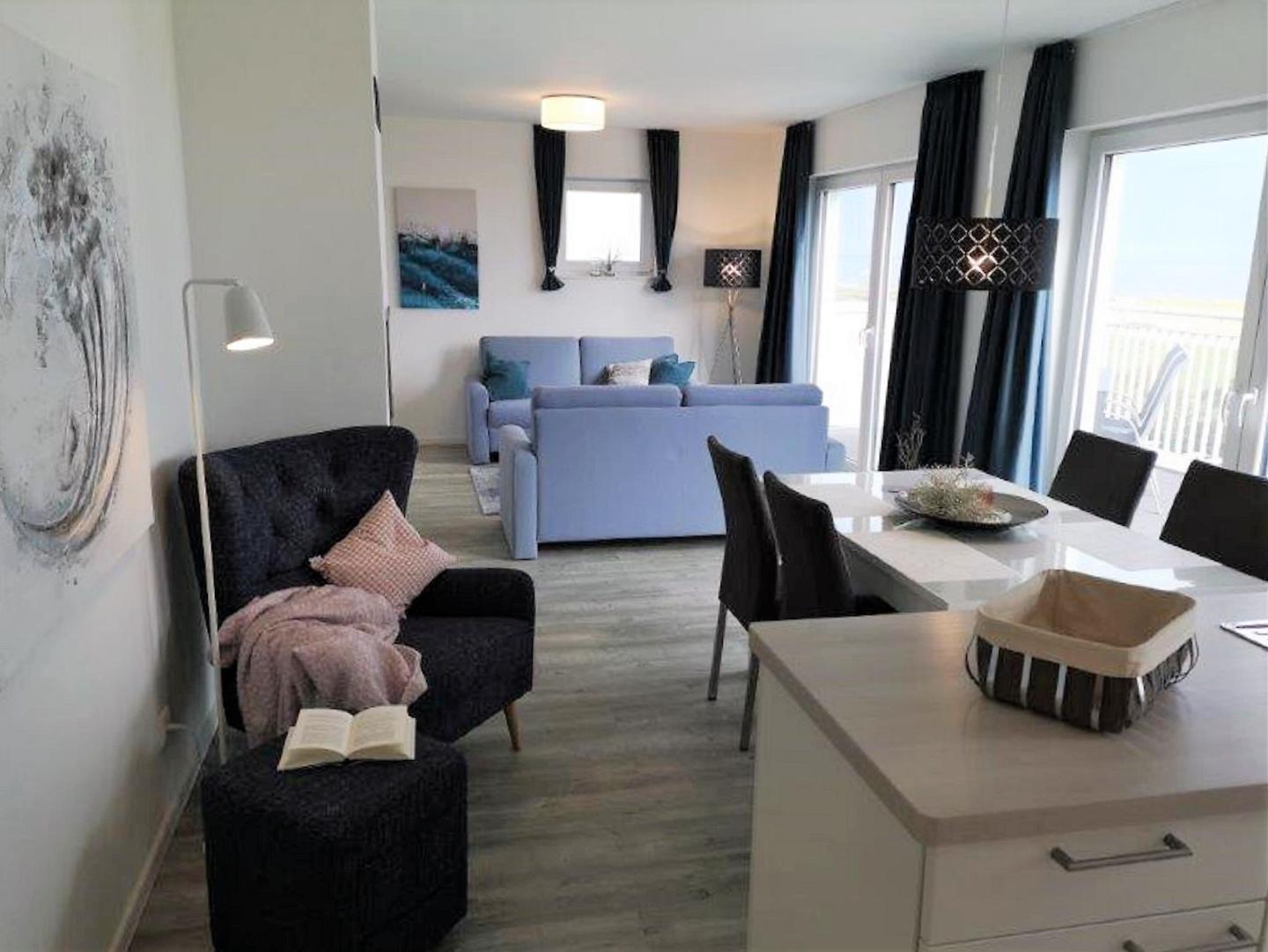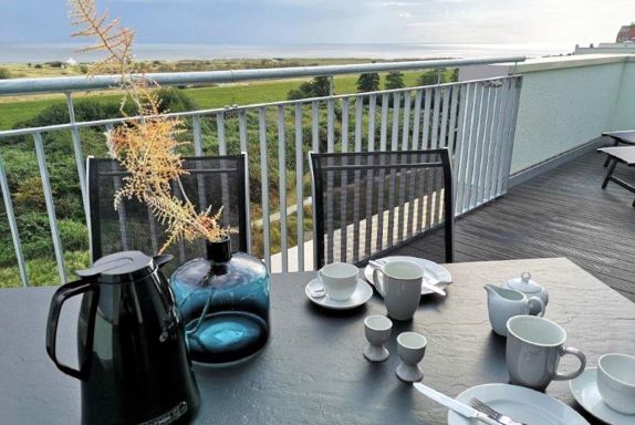 Der Sonnenbalkon mit Blick auf das Wattenmeer lässt keine Wünsche offen. Die Möblierung besteht aus einem Tisch mit vier Stühlen, 2 Liegen sowie einem Strandkorb. Ein Paradies zum Wohlfühlen - das ganze Jahr!