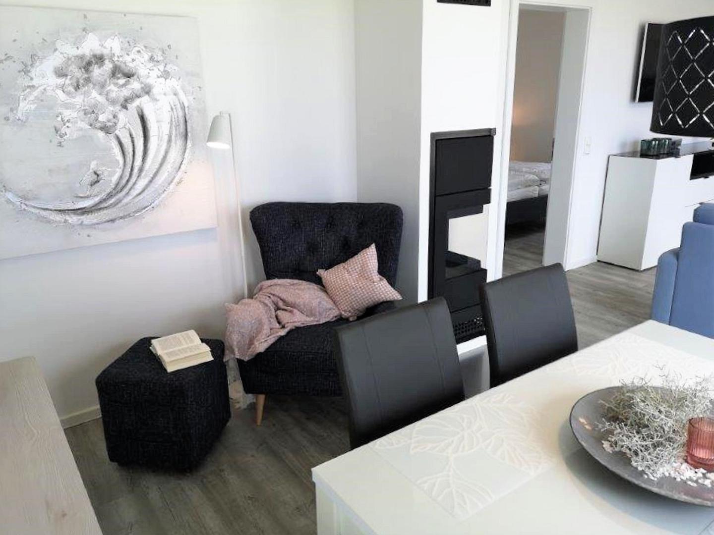 Der offene Wohnbereich mit Kamin rundet das Gesamtbild ab. Zur Befeuerung des Kaminofens sind nur Holzbriketts zugelassen!