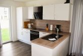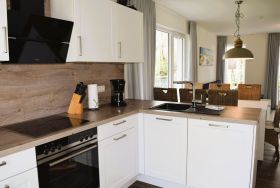 die Küche ist offengehalten und mit einer hochwertigen Einbauküche inklusive Mikrowelle ausgestattet.