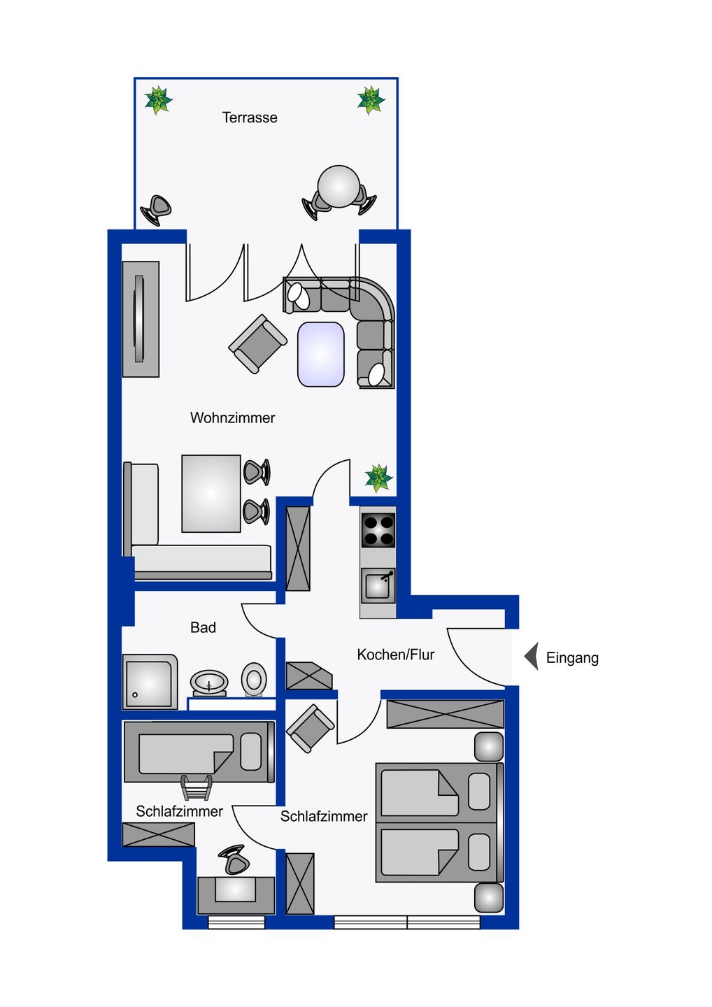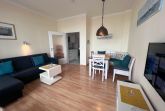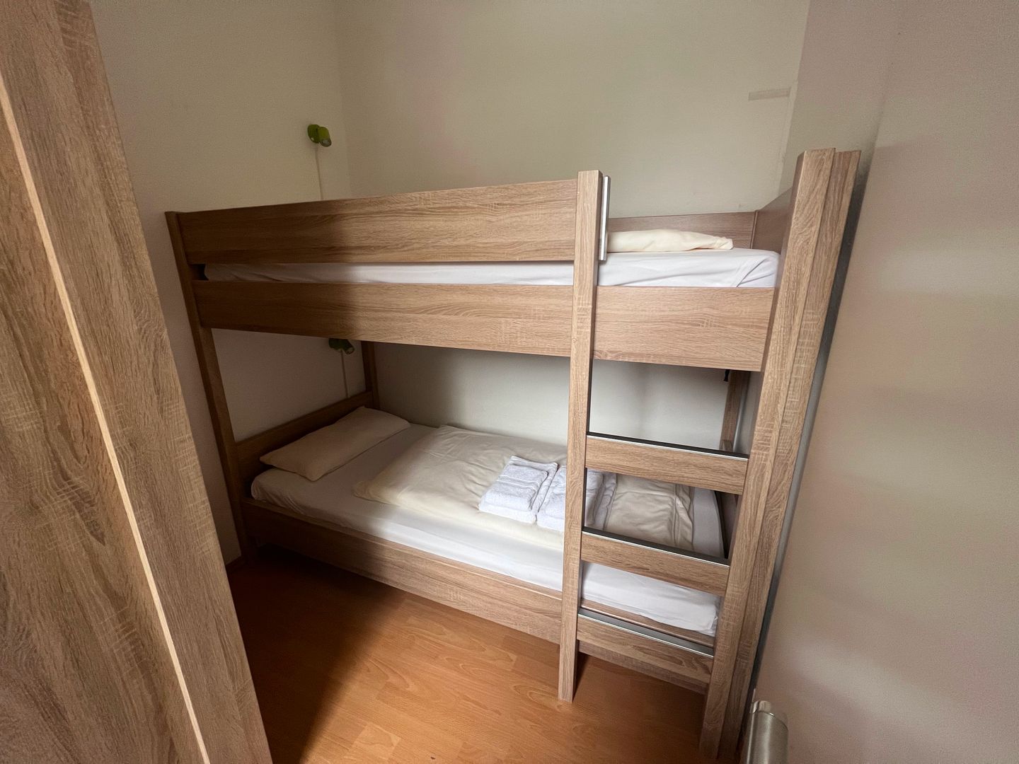 Vom Wohnungsflur zweigen ab: die praktische Küchenzeile, das großzügige Wohnzimmer (mit Ausziehcouch als 5.Schlafmöglichkeit), ein Schlafraum mit einem Doppelbett und ein Kinderschlafraum mit Etagenbetten (2 Meter). Ebenso hat diese Wohnung tief herunter gezogene Fenster. Die Küchenzeile ist gut ausgestattet. Vorhanden sind: eine Mikrowelle, eine Spülmaschine und ein Cerankochfeld. Das Duschbad ist in einem neuen Zustand. Zur Ausstattung gehören: großflächige Fliesen und eine moderne Duschkabine.