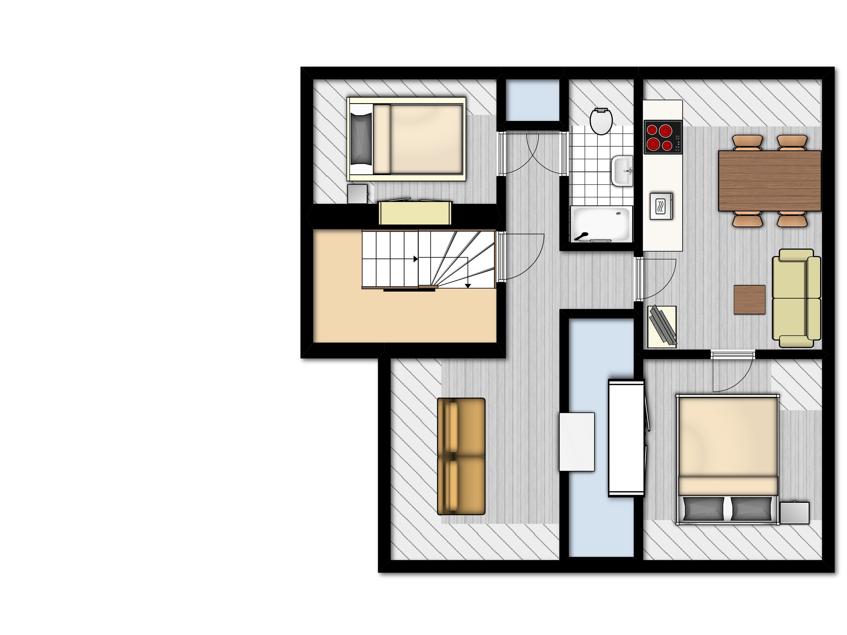 Mit einer Größe von ca. 60 m² Wohnfläche ist die Wohnung komplett bis zu 4 Personen ausgestattet, Wohnzimmer mit Küchenzeile (Backofen, Cerankochfeld, Geschirrspüler, Toaster, Wasserkocher, Kaffeemaschine, Kühlschrank, Mikrowelle), Sofa-Ecke, Essplatz für 4 Personen, 1 Flatscreen TV im Wohnzimmer, 1 Schlafzimmer mit Doppelbett (1,40x2,00m), Kleiderschrank, zweites Schlafzimmer mit Doppelbett (1,60x2,00m), Flur, Bad mit Dusche und WC, Nichtraucherwohnung, keine Haustiere, PKW-Stellplatz am Haus.
