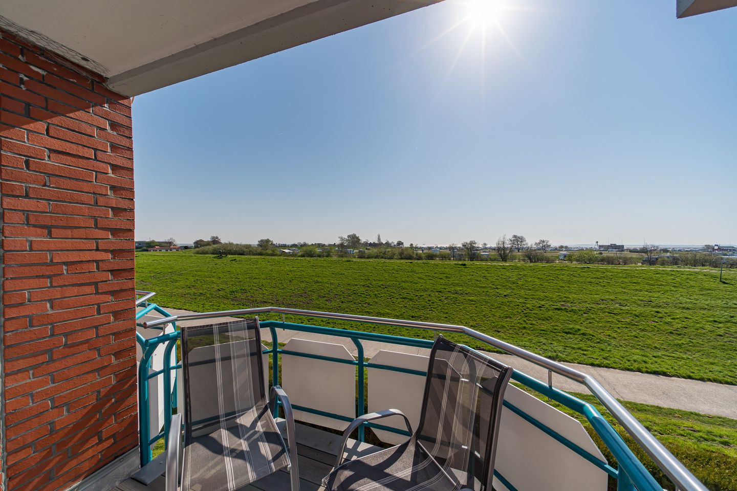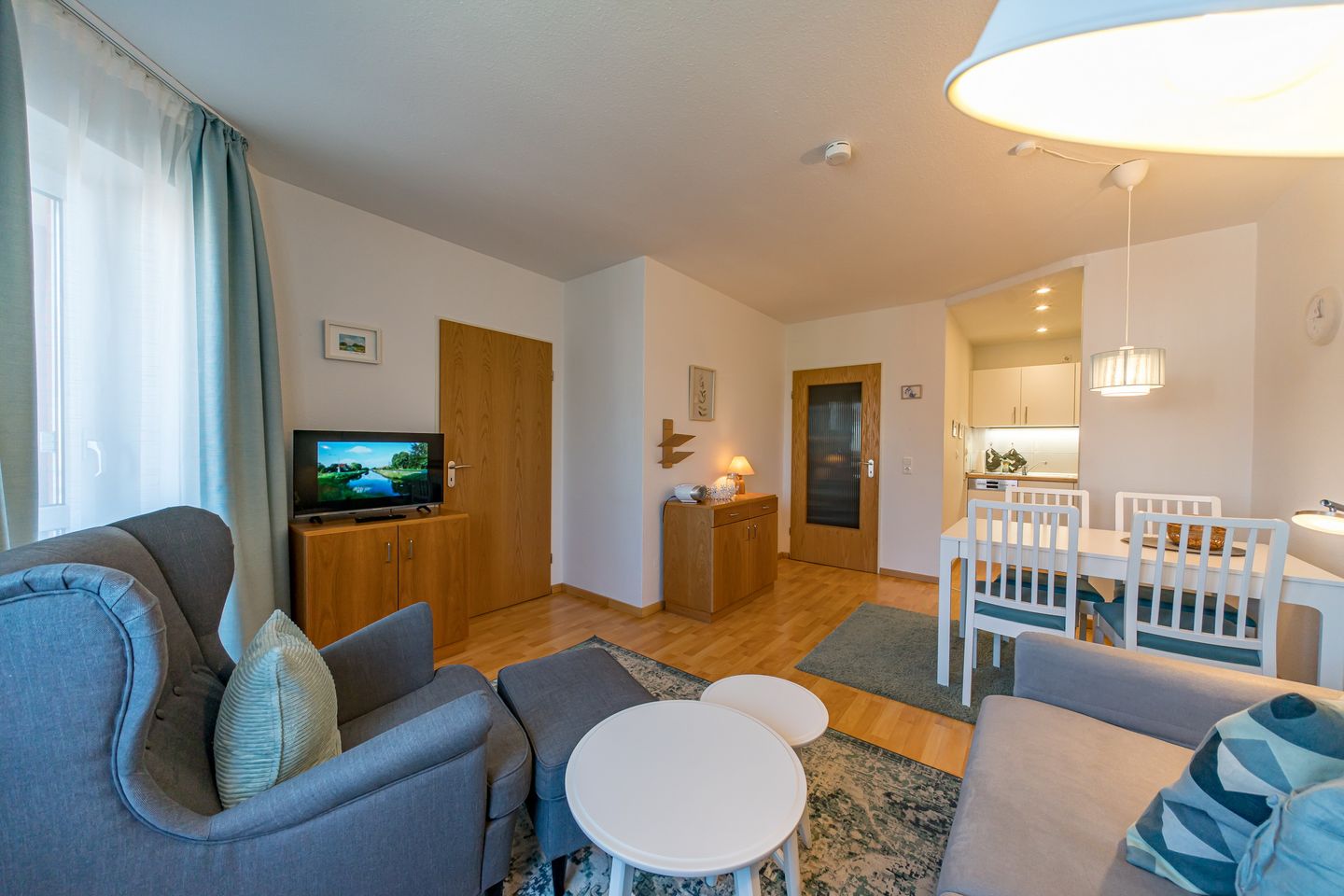 Die Nichtraucherwohnung verfügt über kostenfreies WLAN und eine voll ausgestattete und offene Küche. Diese bietet Geschirrspüler, Kühlschrank mit Tiefkühlfach, Kaffeemaschine, Toaster, Wasserkocher und einen 4-Felder Ceranherd mit Backofen. Im Badezimmer befinden sich eine Dusche, WC und Waschtisch. Das separate Schlafzimmer beinhaltet zwei Einzelbetten. Im Wohn-Essbereich mit Zugang zum Balkon in Nord-West Lage stehen euch Flatscreen-TV und HiFi-Anlage zur Verfügung. Nach einem erholsamen Urlaubstag könnt ihr auf dem überdachten Balkon mit Blick in die malerische friesische Landschaft entspannen und die Abendsonne genießen.