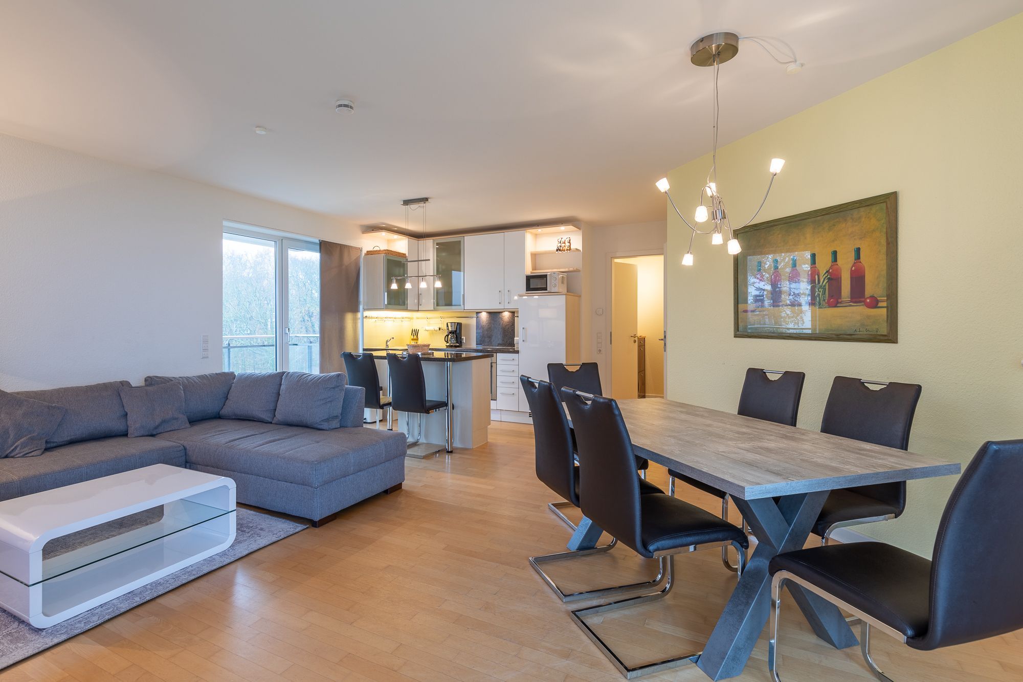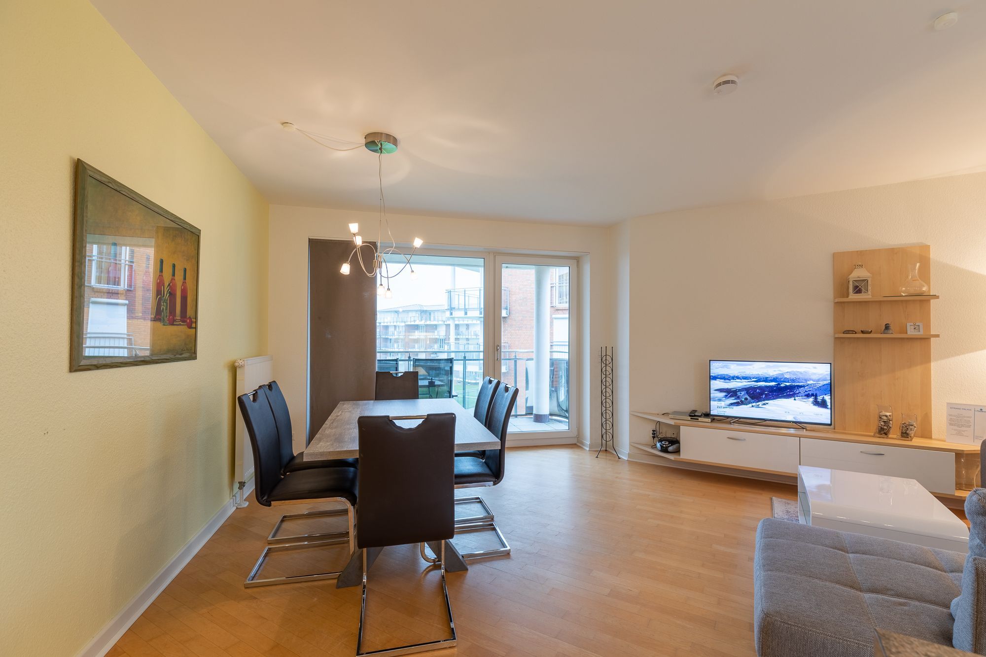 Die 4 Raum Wohnung mit einer Größe von ca. 100 m² Wohnfläche ist komplett bis zu 6 Personen ausgestattet. 1 Schlafzimmer mit einem Doppelbett und Kleiderschrank, 1 Schlafzimmer mit 2 Einzelbetten, 1 kleines Schlafzimmer mit Schlafsofa (1,40x2,00), großes Wohnzimmer mit gemütlicher Sitzecke, Essplatz für 6 Personen, Blick auf die Nordsee, Zugang zum Balkon, mit Küchenbereich Einbauküche (Backofen, Cerankochfeld, Geschirrspüler, Mikrowelle, Toaster, Kaffeemaschine, Wasserkocher), 1 Tageslichtbad mit Wanne und WC, 1 separates Gäste WC, 1 Flatscreen TV, Nichtraucherwohnung, keine Haustiere, PKW-Stellplatz in der Tiefgarage (Höhe der Einfahrt 1,90 m).