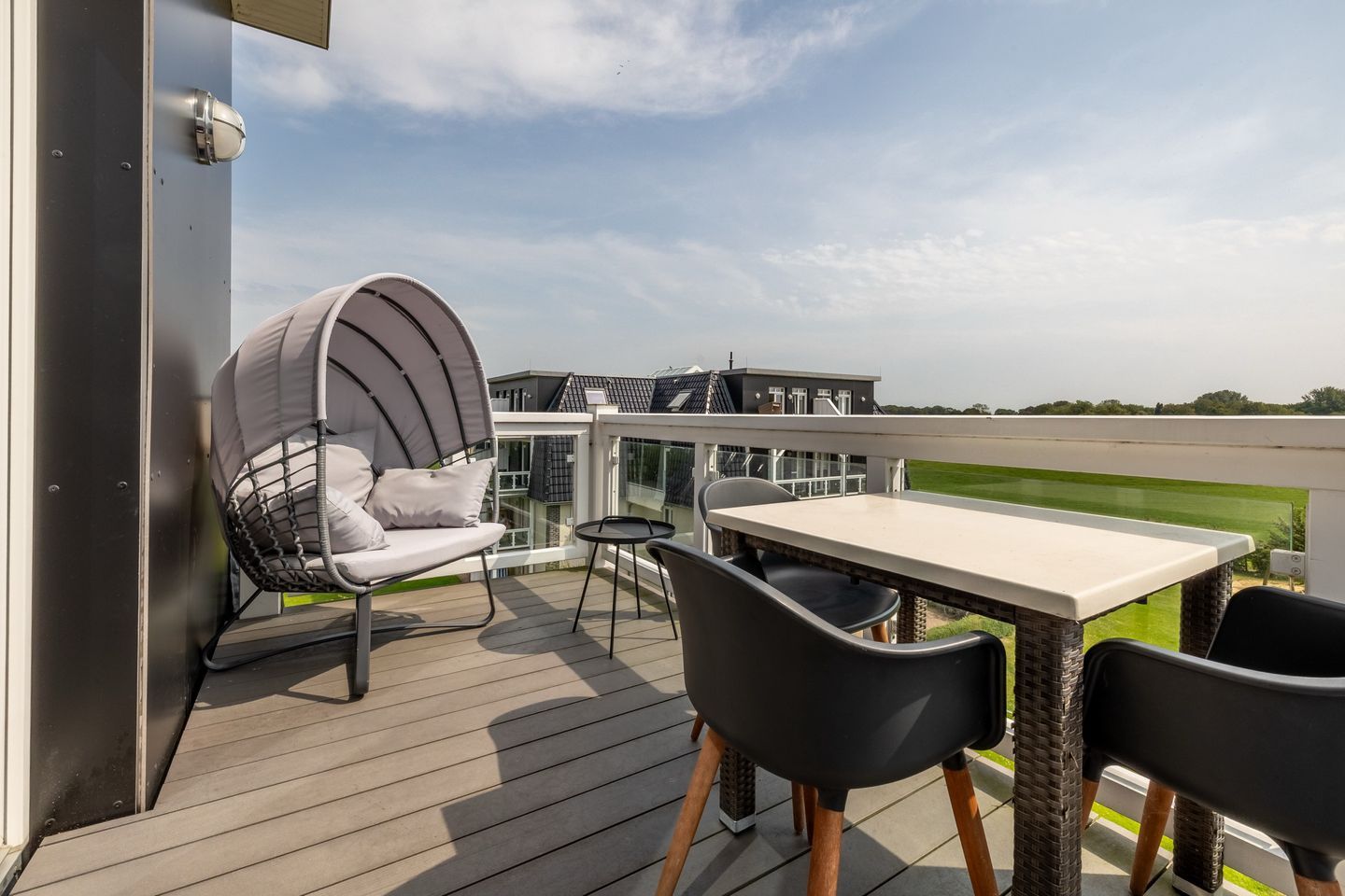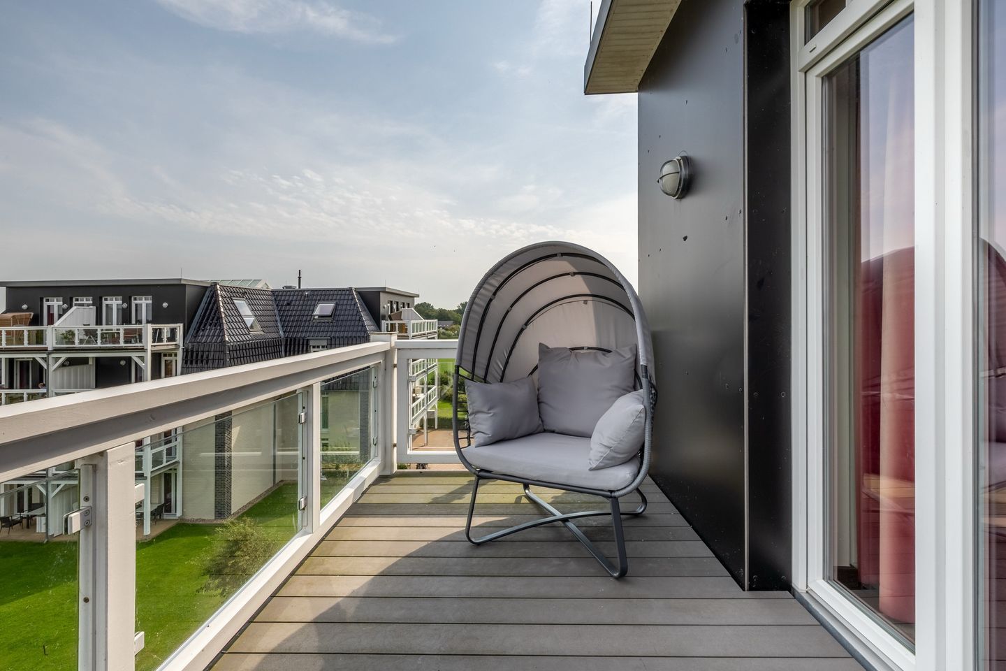 Im komfortablen Badezimmer mit begehbarer Dusche, Doppelwaschtisch, Föhn und Kosmetikspiegel befindet sich eine eigene Sauna zur vollkommenen Entspannung in privater Atmosphäre. Das Apartment verfügt außerdem über ein separates WC mit Bidet und Waschbecken, ein zweites TV-Gerät in einem der Schlafzimmer sowie über einen Bluetooth-Lautsprecher, Wecker, Bücher und Gesellschaftsspiele. Zwei sonnige Balkone mit Gartenmöbeln für vier Personen - begehbar vom Wohn- bzw. Schlafzimmer des Penthauses - machen das Urlaubsdomizil perfekt. Auf beiden Balkonen wartet jeweils ein gemütlicher Gartenmuschel-Sessel mit halbrundem Sonnendach auf euch – windgeschützt und perfekt zum Entspannen.