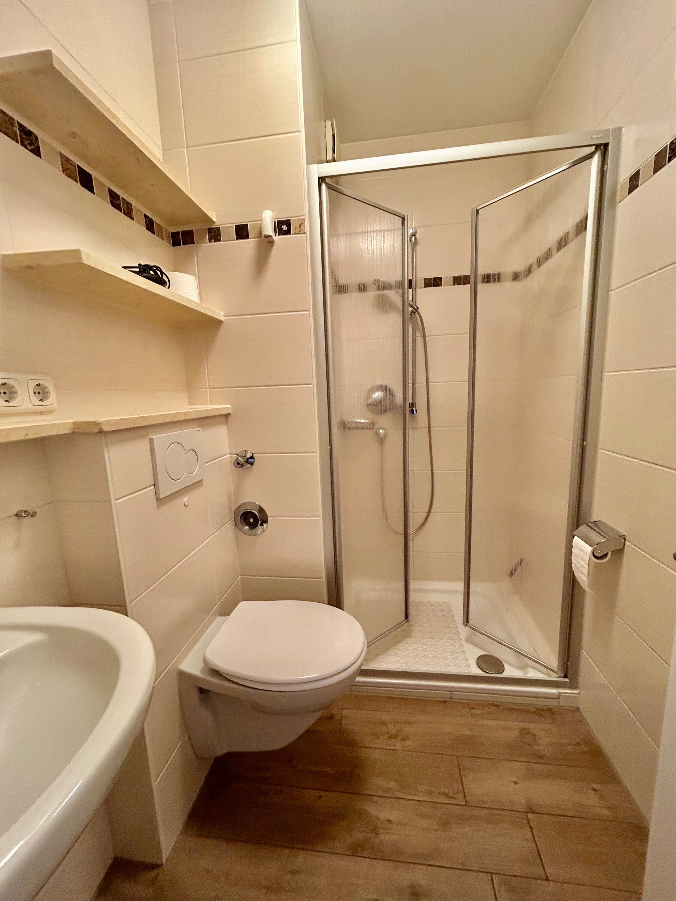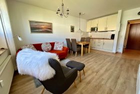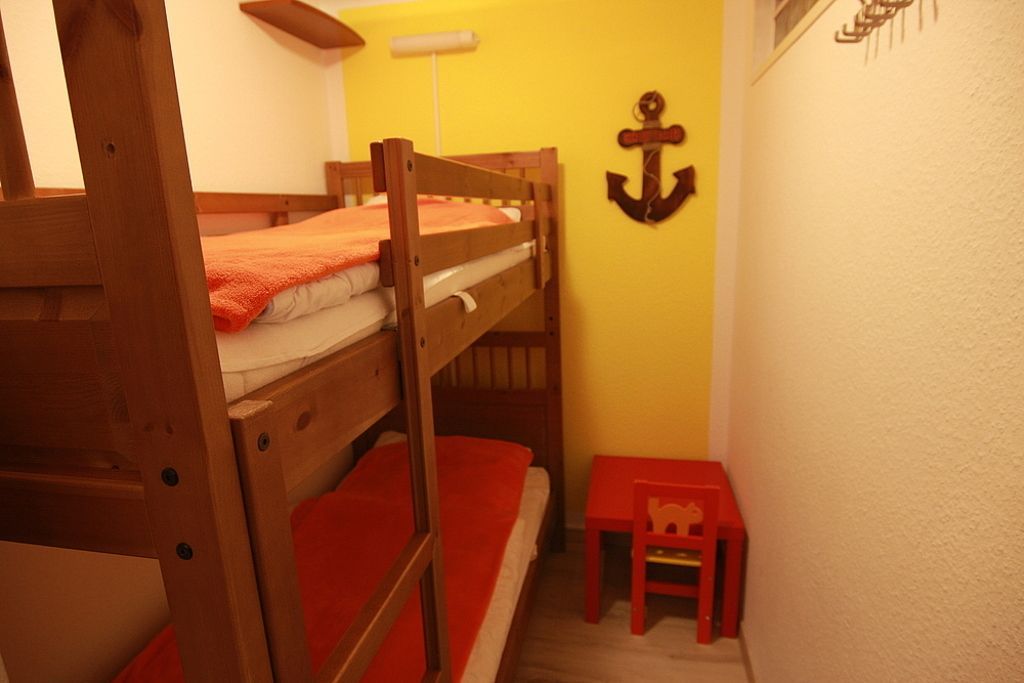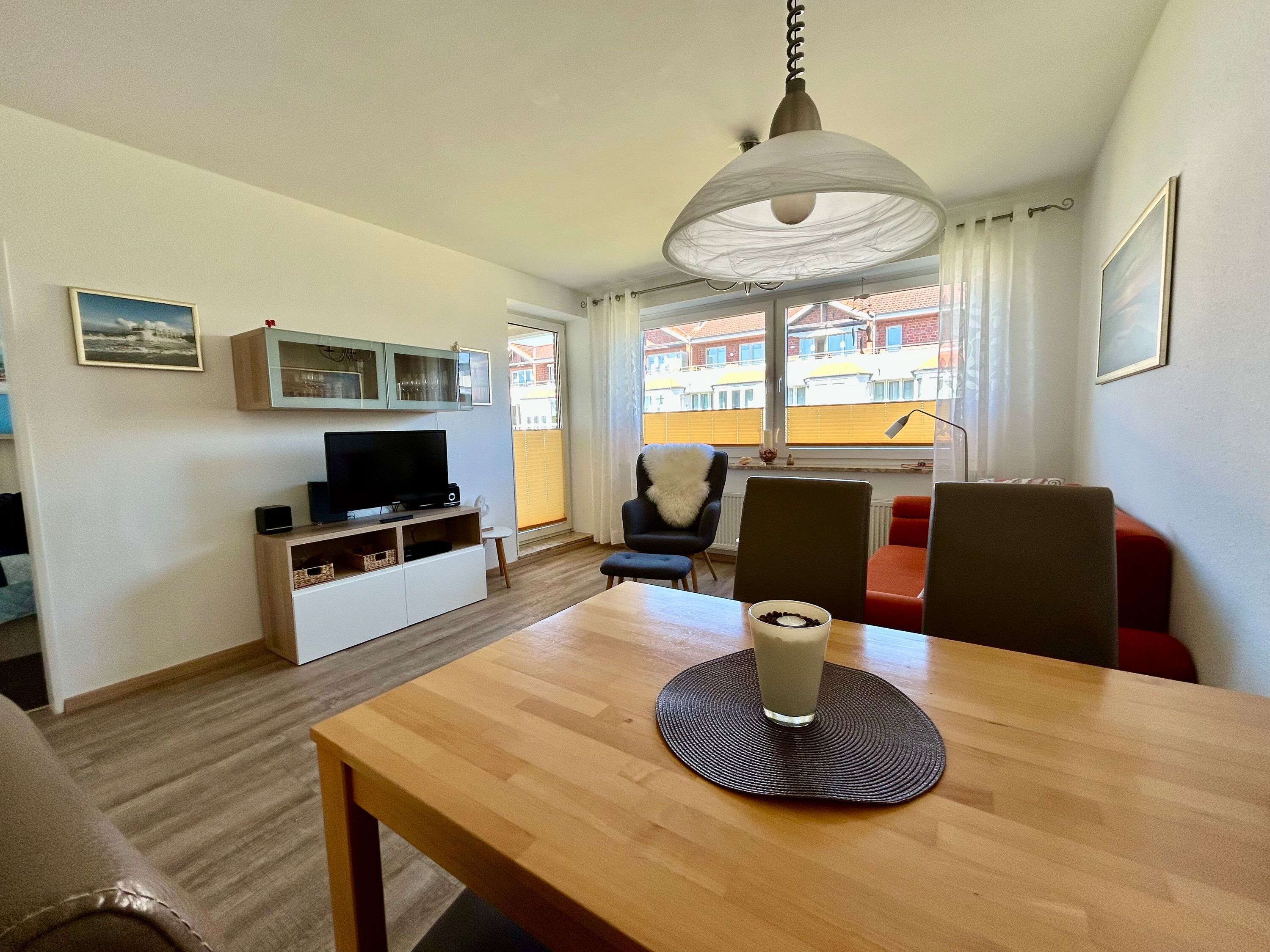 Die Wohnung ist für bis zu 4 Personen ausgestattet. 1 Schlafzimmer mit Ehebetten, 1 Schlafzimmer mit Etagenbetten ein modernes Wohnzimmer mit Korbsessel, Flatscreen TV, Mini Stereoanlage, Essplatz mit 4 Stühlen und Zugang zum Balkon (mit Gartenmöbel), Küchenzeile (Ceranfeld, Mikrowelle, Kaffeemaschine, Wasserkocher, Toaster, Geschirrspüler), 1 Bad mit Dusche und WC, Flur, PKW-Stellplatz am Haus, Nichtraucher, es sind keine Tiere erlaubt.