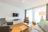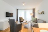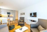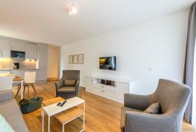 Das geschmackvoll eingerichtete Nichtraucher-Apartment verfügt über kostenfreies WLAN. Der Wohnbereich mit Schlafcouch, bietet eine voll ausgestattete offene Küchenzeile mit Geschirrspüler, Gefrierfach, Kaffeemaschine, Toaster, Wasserkocher und Mikrowelle mit Backfunktion sowie einen großen Flatscreen-TV und ein Radio. Das Apartment verfügt über einen Esstisch für 5 Personen und einen behaglichen Sitzbereich. Zwei separate Schlafzimmer stehen euch zur Verfügung. Eines davon verfügt über ein Doppelbett und einen eigenen Flatscreen-TV, ein weiteres über ein Etagenbett. Ein Kinderbett kann gegen Entgelt aufgestellt werden. Im stilvollen Badezimmer befinden sich eine große begehbare Dusche sowie ein Waschtisch mit Föhn und Kosmetikspiegel. Nach einem erlebnisreichen Urlaubstag lässt es sich auf der überdachten und mit Gartenmöbeln ausgestatteten Terrasse wunderbar entspannen.