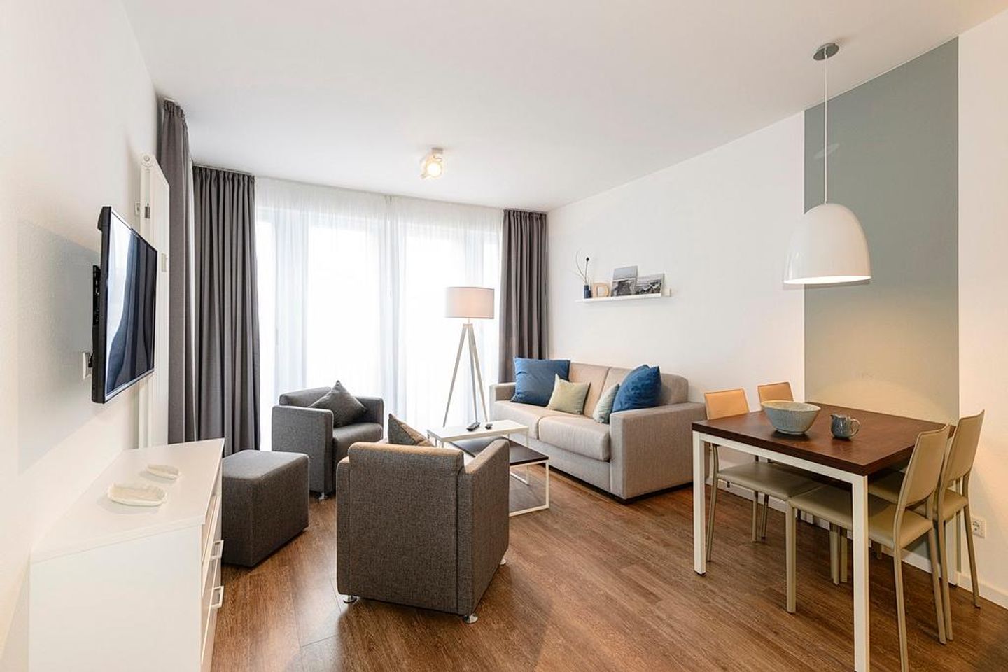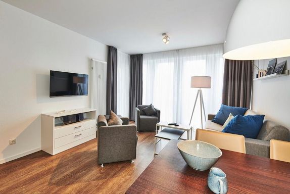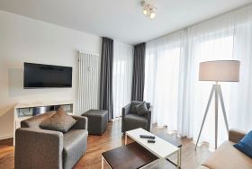 Das geschmackvoll eingerichtete Nichtraucher-Apartment verfügt über kostenfreies WLAN. Der Wohnbereich mit einer Schlafcouch bietet eine voll ausgestattete offene Küchenzeile mit Geschirrspüler, Gefrierfach, Kaffeemaschine, Toaster, Wasserkocher und Mikrowelle mit Backfunktion sowie einen großen Flatscreen-TV mit CD-Player und ein Radio. Das Apartment verfügt über einen Esstisch für 5 Personen und einen behaglichen Sitzbereich. Zwei separate Schlafzimmer stehen euch zur Verfügung. Eines davon verfügt über ein Doppelbett und einen eigenen Flatscreen-TV, ein weiteres über zwei Einzelbetten. Ein Kinderbett kann gegen Entgelt aufgestellt werden. Im stilvollen Badezimmer befinden sich eine große begehbare Dusche sowie ein Waschtisch mit Föhn und Kosmetikspiegel. Nach einem erlebnisreichen Urlaubstag entspannt ihr auf dem überdachten und mit Gartenmöbeln für 4 Personen ausgestatteten Balkon. Der Balkon ist vom Wohnbereich und vom Hauptschlafzimmer aus zugänglich.