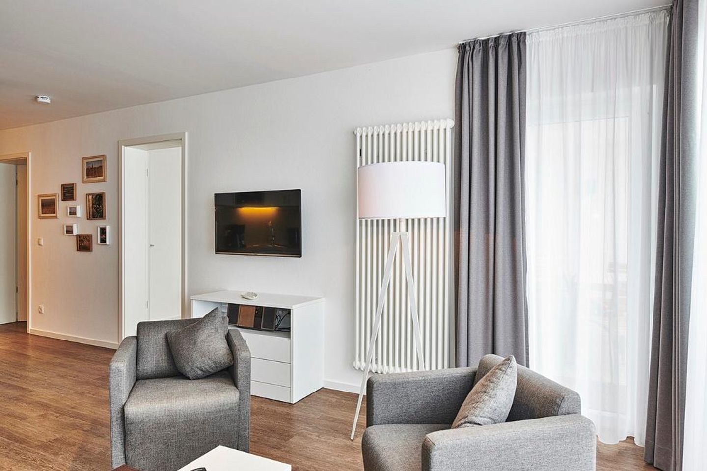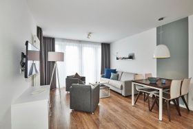 Das geschmackvoll eingerichtete Nichtraucher-Apartment verfügt über kostenfreies WLAN. Der Wohnbereich bietet eine voll ausgestattete offene Küchenzeile mit Geschirrspüler, Gefrierfach, Kaffeemaschine, Toaster, Wasserkocher, Mikrowelle und Backofen sowie einen großen Flatscreen-TV und ein Radio. Das Apartment verfügt über einen Esstisch für 5 Personen und einen behaglichen Sitzbereich mit Schlafcouch. Zwei separate Schlafzimmer stehen euch zur Verfügung. Eines davon verfügt über ein Doppelbett mit Überlänge von 2,20 m und einen eigenen Flatscreen-TV, ein weiteres über zwei Einzelbetten. Ein Kinderbett kann gegen Entgelt aufgestellt werden. Im stilvollen Badezimmer befinden sich eine große begehbare Dusche sowie ein Waschtisch mit Föhn und Kosmetikspiegel. Nach einem erlebnisreichen Urlaubstag entspannt ihr auf dem überdachten und mit Gartenmöbeln ausgestatteten Balkon. Der Balkon ist vom Wohnbereich und vom Hauptschlafzimmer aus zugänglich.