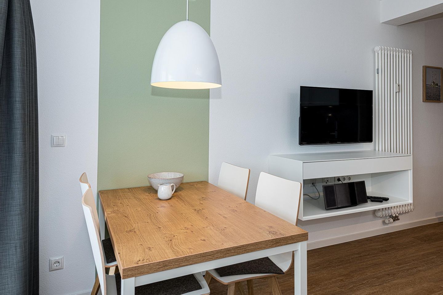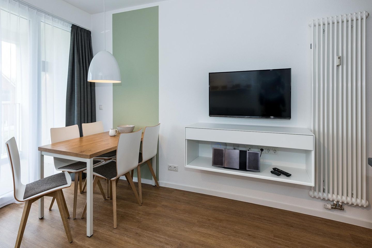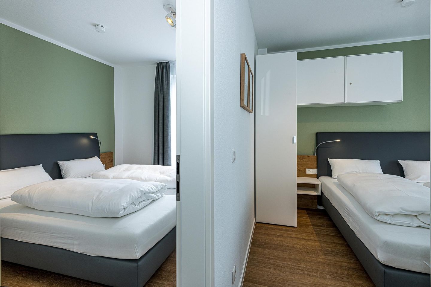 Das geschmackvoll eingerichtete Nichtraucher-Apartment verfügt über kostenfreies WLAN. Der Wohnbereich bietet eine voll ausgestattete offene Küchenzeile mit Geschirrspüler, Gefrierfach, Backofen, Kaffeemaschine, Toaster, Wasserkocher und Mikrowelle sowie einen großen Flatscreen-TV und ein Radio. Das Apartment verfügt über einen Esstisch für 4 Personen und einen behaglichen Sitzbereich. Zwei separate Schlafzimmer mit jeweils einem Doppelbett stehen euch zur Verfügung. Eines davon verfügt zudem über einen eigenen Flatscreen-TV. Ein Kinderbett kann gegen Entgelt aufgestellt werden. Im stilvollen Badezimmer befinden sich eine große begehbare Dusche sowie ein Waschtisch mit Föhn und Kosmetikspiegel. Nach einem erlebnisreichen Urlaubstag entspannt ihr auf dem überdachten und mit Gartenmöbeln für 4 Personen ausgestatteten Balkon. Die Fenster des Apartments verfügen über Insektenschutz.
