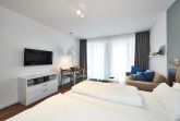 Das geschmackvoll eingerichtete Nichtraucher-Apartment verfügt über kostenfreies WLAN. Der Wohn- und Schlafbereich bietet eine voll ausgestattete offene Küchenzeile mit Geschirrspüler, Gefrierfach, Kaffeemaschine, Toaster, Wasserkocher und Mikrowelle mit Backfunktion sowie ein Doppelbett und eine Schlafcouch (1,10 x 1,90 m), einen großen Flatscreen-TV und ein Radio. Das Apartment verfügt über einen Esstisch für 3 Personen und einen behaglichen kleinen Sitzbereich. Ein Kinderbett kann gegen Entgelt aufgestellt werden. Im stilvollen Badezimmer befinden sich eine große begehbare Dusche sowie ein Waschtisch mit Föhn und Kosmetikspiegel. Nach einem erlebnisreichen Urlaubstag entspannt ihr auf dem überdachten und mit Gartenmöbeln für 3 Personen ausgestatteten Balkon.