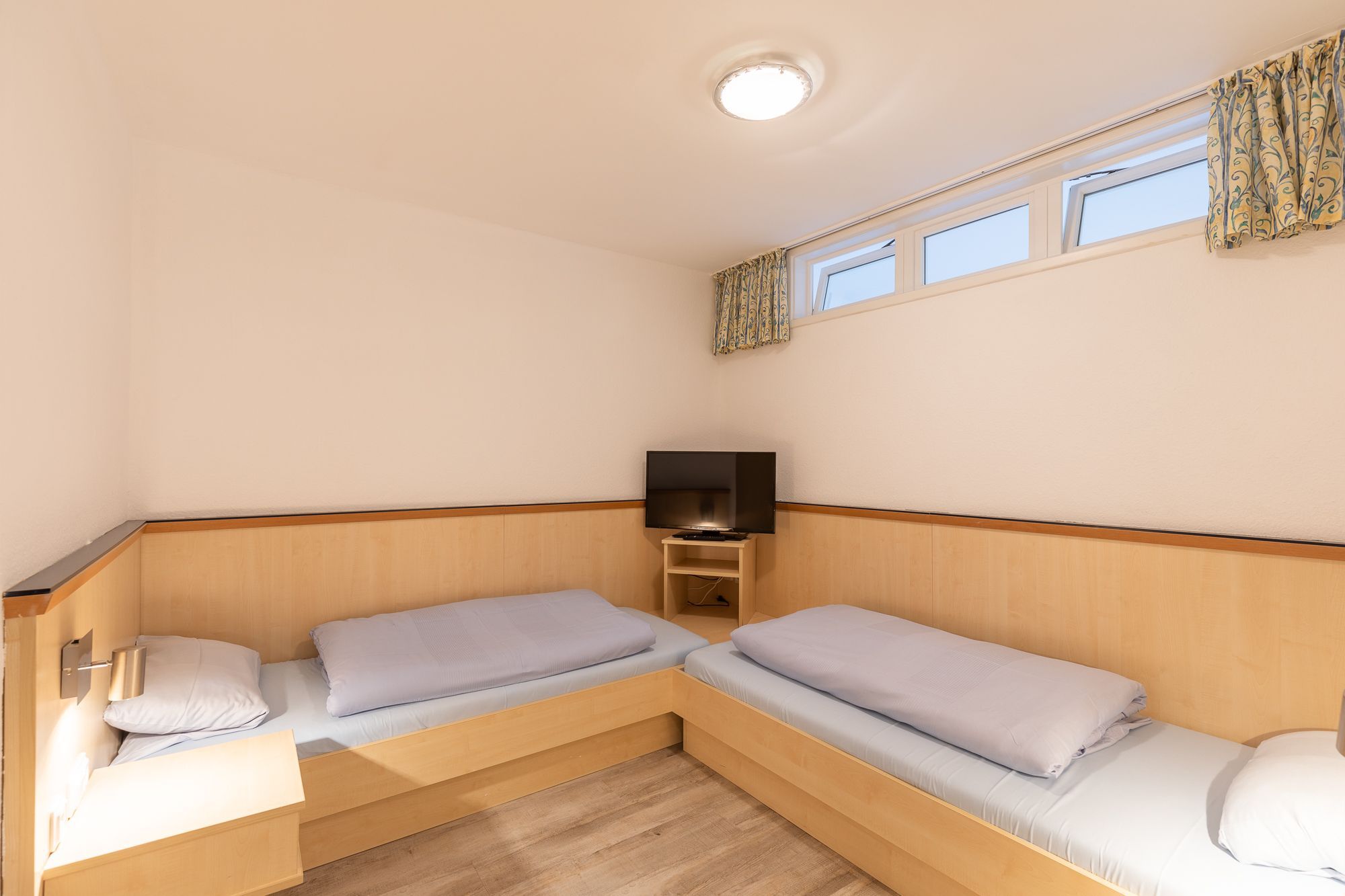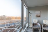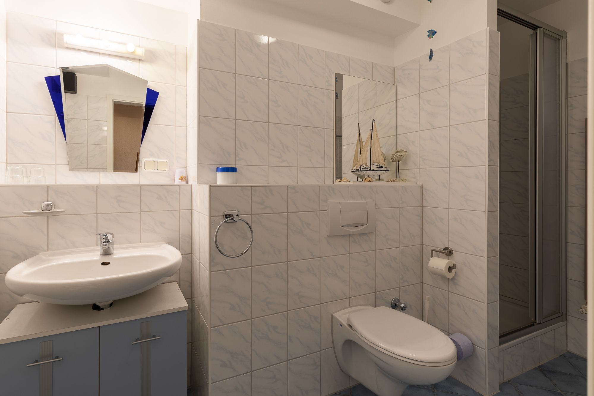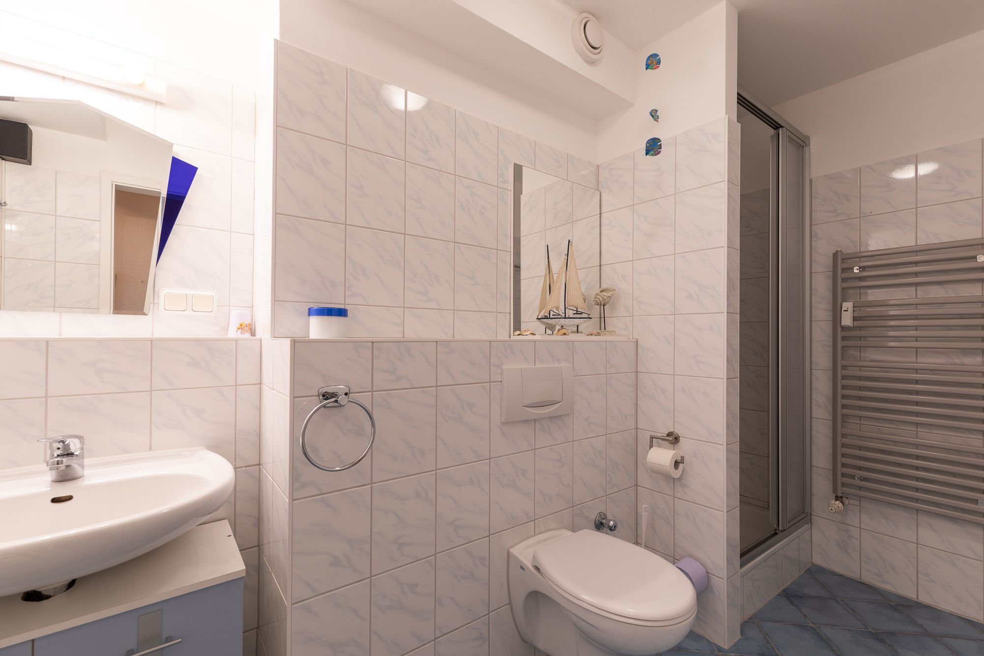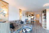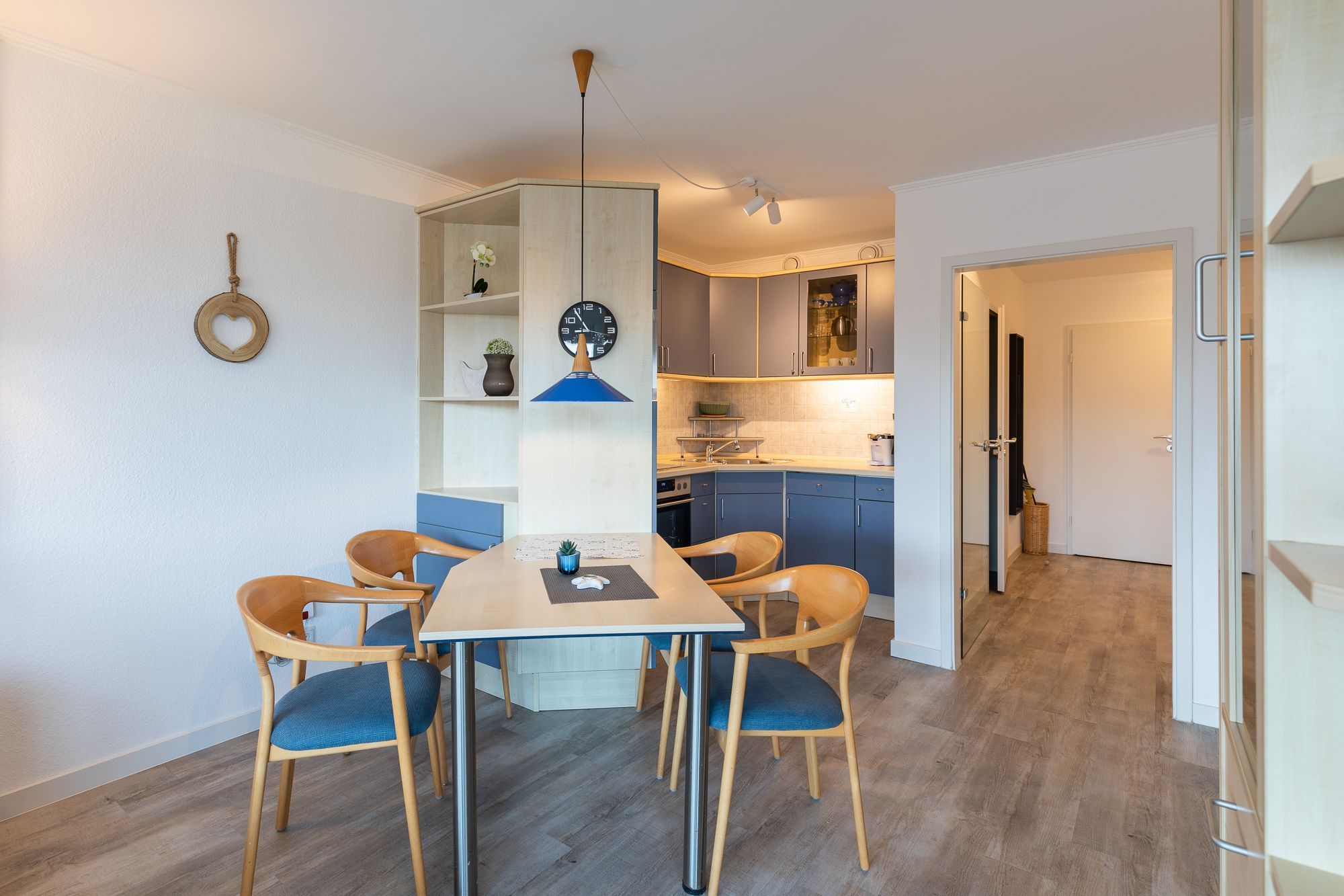 Die schöne 2 Zimmer Wohnung im 2. Obergeschoss, für bis zu 4 Personen, 1 Wohnzimmer mit 2 gemütlichen Sitzecken (2er und 3er Sofa, 1 Sessel), Essplatz für 4 Personen, Küchenzeile (4 Plattenherd, Backofen, Geschirrspüler, Kaffeemaschine, Wasserkocher, Toaster und Mikrowelle), TV, ein innenliegendes Schlafzimmer mit 2 Einzelbetten und Kleiderschrank (das innenliegende Schlafzimmer verfügt oberhalb über 3 schmale Fenster, die zum Wohnzimmer geöffnet werden können), Bad mit Dusche und WC, Balkon (mit Tisch und 4 Stühlen), Fahrstuhl im Haus, reservierter PKW Stellplatz in der Tiefgarage.