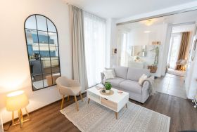 Mit dem Auto kannst Du unsere kostenfreien Stellplätze direkt am Haus nutzen. Dich erwartet ein 59 Quadratmeter großes Apartment mit 1 Schlafzimmern, 1 Bad, Wohnzimmer, Küche und Gäste WC.