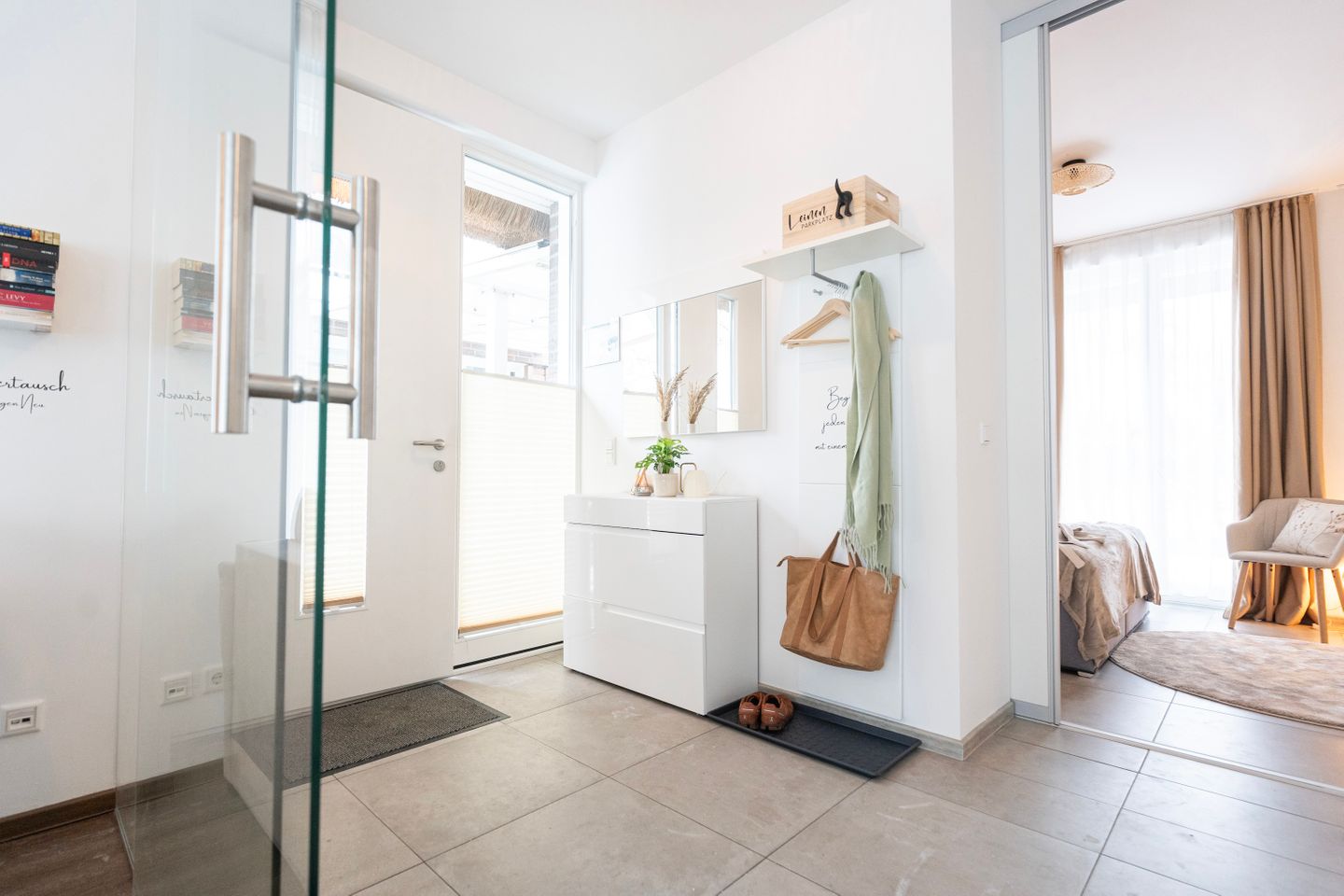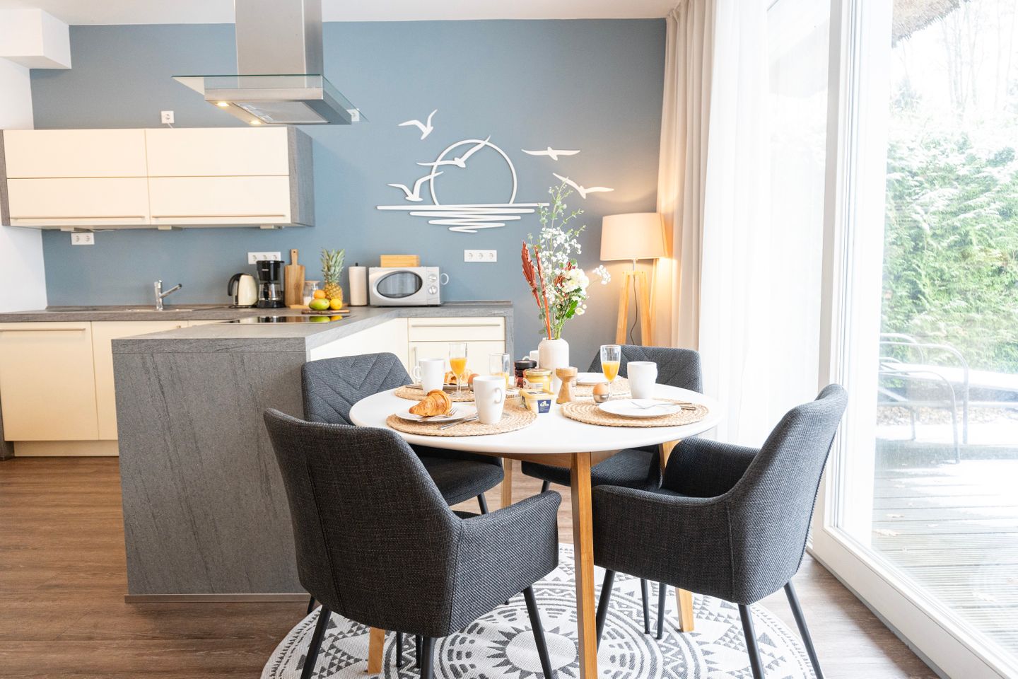 Die Küche ist natürlich voll ausgestattet mit Herd, Kühlschrank, Backofen, Spülmaschine, Mikrowelle und allem was Du sonst brauchst um lecker zu kochen. Das Apartment verfügt ebenso über eine Waschmaschine.