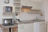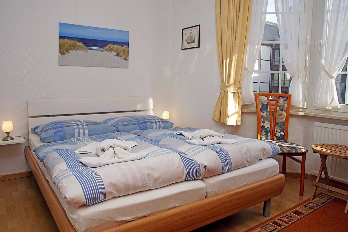 Die Ferienwohnung (Hochparterre) mit einer Größe von ca. 32 m² Wohnfläche ist komplett bis zu 2 Personen ausgestattet. 1 Wohnzimmer mit Essplatz, Erker, 1 Flachbildfernseher mit Soundsystem, Sofa und Sessel, Küche mit Mikrowelle, Mini Backofen, Kühlschrank, Cerankochfeld, Kaffeemaschine, Wasserkocher und Toaster, Schlafzimmer mit Doppelbett (160x200cm), Teilblick vom Schlafzimmer auf die Nordsee und Kleiderschrank, Flur, Bad mit Dusche und WC, Nichtraucherwohnung, keine Haustiere, PKW-Stellplatz am Haus.