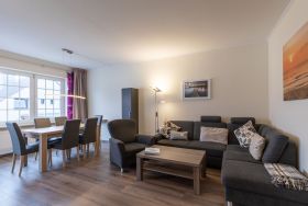Die Ferienwohnung mit einer Größe von ca. 60m² Wohnfläche ist komplett bis zu 5 Personen ausgestattet. 1 Wohnzimmer mit Essplatz am Fenster, Ecksofa-/Schlafsofa, 1 Flachbildfernseher, 1 DVD Player, Küchenzeile (Cerankochfeld, Kühlschrank, Kaffeemaschine, Wasserkocher, Geschirrspüler und Toaster), Balkon zum Süden mit Tisch und 4 Stühlen,1 Schlafzimmer mit Doppelbett (180x200cm) und Schrank, 1 Schlafzimmer mit Doppelbett (140x200cm) und Schrank, Flur, Bad mit Dusche, WC, Waschbecken und Spiegel, Nichtraucherwohnung, keine Haustiere, PKW-Stellplatz am Haus (schmaler Stellplatz der nur Rückwärts befahren werden kann).