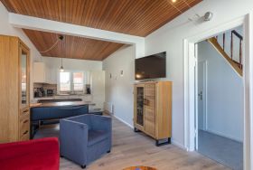 Die Doppelhaushälfte, mit einer Größe von ca. 80 m² Wohnfläche ist komplett bis zu 5 Personen ausgestattet. Wohnzimmer mit gemütlicher Sitzecke, TV, Einbauküche (Cerankochfeld, Backofen, Dunstabzugshaube, Geschirrspüler, Kühlschrank mit Gefrierfach, Kaffeemaschine, Toaster, Wasserkocher, Senseo Maschine), Essplatz, Tageslichtbad mit Dusche, Wanne und WC, Schlafbereich im Obergeschoss, über eine Treppe in der Wohnung zu erreichen, Flur mit Zugang zum Schlafzimmer 1 mit Doppelbett, TV, Kleiderschrank (von hier aus gelangt man in das 2. Schlafzimmer), Schlafzimmer 2 mit 2 Einzelbetten, Kleiderschrank, TV (von hier aus gelangt man auch in das Schlafzimmer 3), Schlafzimmer 3 mit einem 1,40 Bett, Kleiderschrank und TV (vom Schlafzimmer 3 aus gelangt man wieder in den Flur vom Obergeschoss. Nichtraucherhaus, keine Haustiere.