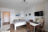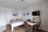 Die geschmackvoll eingerichtete Ferienwohnung mit einer Größe von ca. 35 m² Wohnfläche ist bis zu 2 Personen ausgestattet. 1 Wohn-Schlafzimmer mit Doppelbett, Sofa, Küchenzeile (Herd, Kühlschrank, Wasserkocher, Kaffeemaschine, Toaster), Esstisch, Bad mit WC und Dusche und direktem Zugang zum großen Balkon, Nichtraucherwohnung, PKW-Stellplatz direkt am Haus.