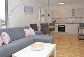 Die modern eingerichtete Wohnung mit einer Größe von ca. 68 m² Wohnfläche ist komplett bis zu 4 Personen ausgestattet. 1 Schlafzimmer mit Doppelbett, Schrank, TV, 1 Schlafzimmer mit Schlafsofa und Zugang zur verglasten Loggia (die komplett geöffnet werden kann) und TV, Wohnzimmer mit kompletter Einbauküche (Backofen, Cerankochfeld, Geschirrspüler, Toaster, Kaffeemaschine, Wasserkocher), Essplatz, Sofa-Ecke und direktem Zugang zur verglasten Loggia (die Fensterelemente in der Loggia können komplett geöffnet werden) , 1xDusche mit WC, Waschmaschine, Nichtraucherwohnung, keine Haustiere, PKW-Stellplatz direkt am Haus.