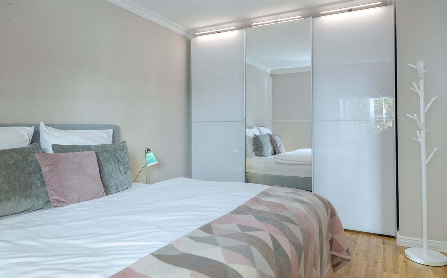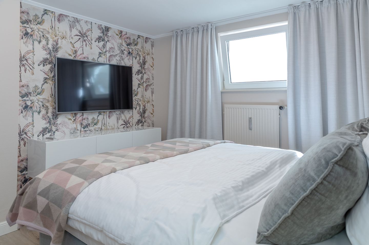 Zwei stilvolle Schlafzimmer mit hochwertigen Boxspringbetten sorgen für erholsamen Schlaf, ergänzt durch eine gemütliche Schlafcouch im Souterrain. Zwei elegante Badezimmer mit großzügigen Duschen bieten entspannte Wellness-Momente.