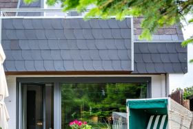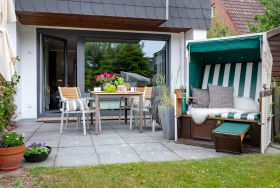 Das Herzstück bildet der lichtdurchflutete Wohnraum, der mit seiner großen Fensterfront den Blick auf die windgeschützte Süd-Terrasse freigibt, welche von morgens bis abends in der Sonne liegt. Der originale Sylter Strandkorb lädt an kühlen Tagen zum Sonnenbad ein.