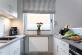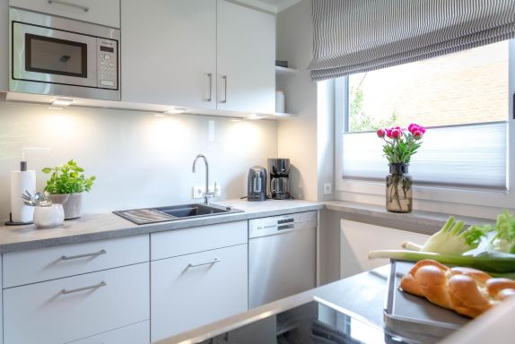 Im Wohnbereich, der durch sein helles Eichenparkett Behaglichkeit ausstrahlt, können Sie auf gemütlichen Sofa-Elementen die Seele baumeln lassen und auf dem Smart TV Ihre Lieblingsfilme über Netflix & Co schauen, oder am stilvollen Esstisch gesellige Stunden verbringen. Hier grenzt zudem die offene Küche an, sodass das Kochen zum gemeinsamen Erlebnis werden kann. Durch die hochwertige Ausstattung wird die Selbstversorgung für Sie zum Vergnügen.