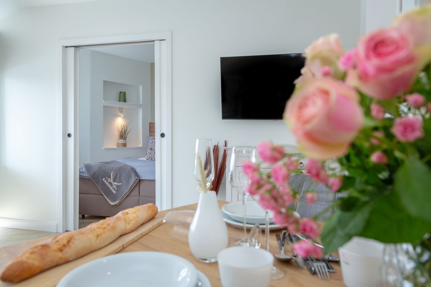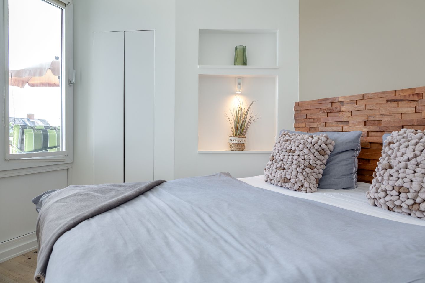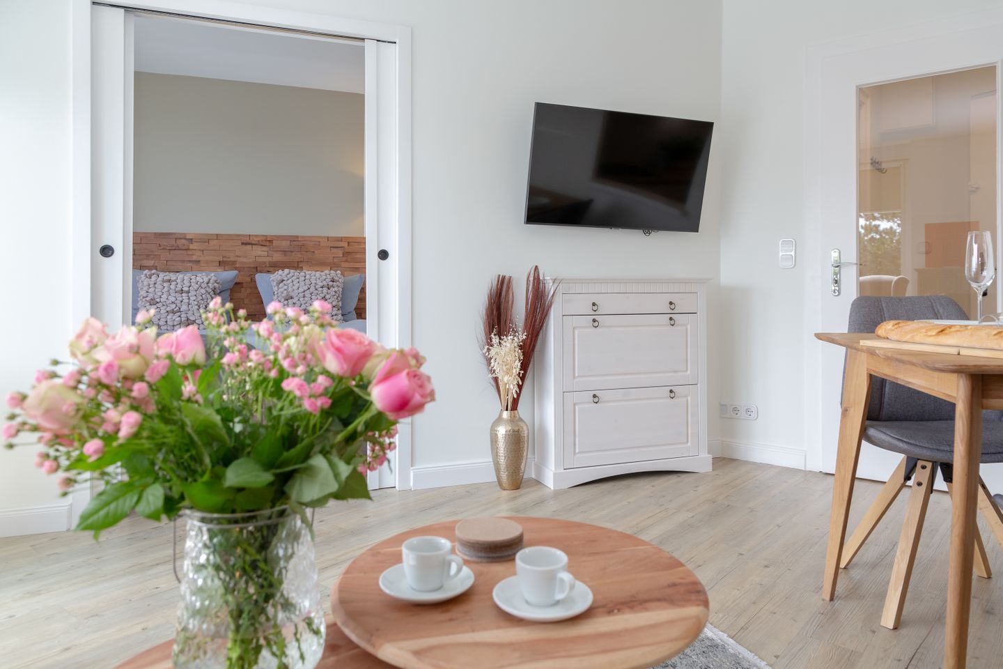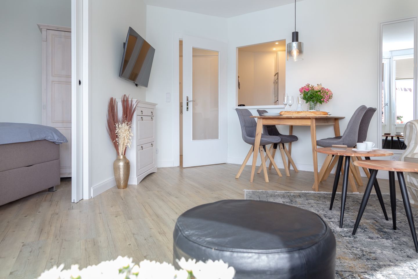 Das Herzstück der Wohnung bildet der helle und elegant gestaltete Wohn- und Schlafbereich, in dem sich sowohl ein komfortables Boxspringbett, als auch ein behagliches Sofa befinden.